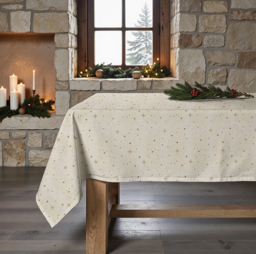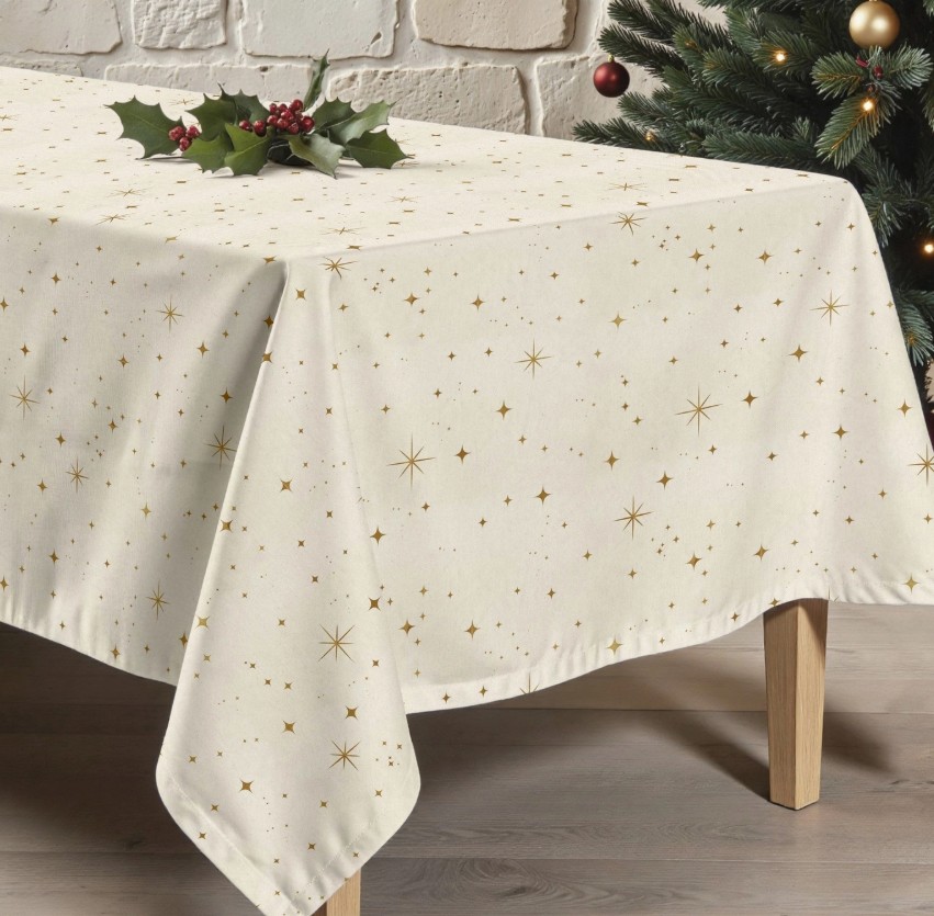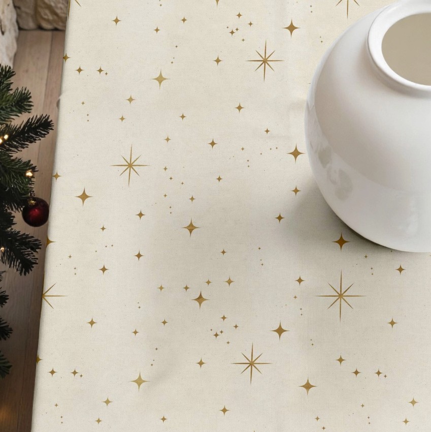 Diese stilvolle Tischdecke vereint natürliches Design mit moderner Funktionalität. Das zarte Sternenmuster in Gold auf naturfarbenem Grund bringt festlichen Glanz auf deinen Tisch – perfekt für Weihnachten und das ganze Jahr.