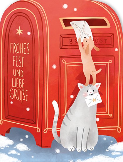 LIEBEVOLLES MOTIV: Katze und Hund werfen ihre Weihnachtspost in den Briefkasten – modernes, warmes Design für Groß und Klein.