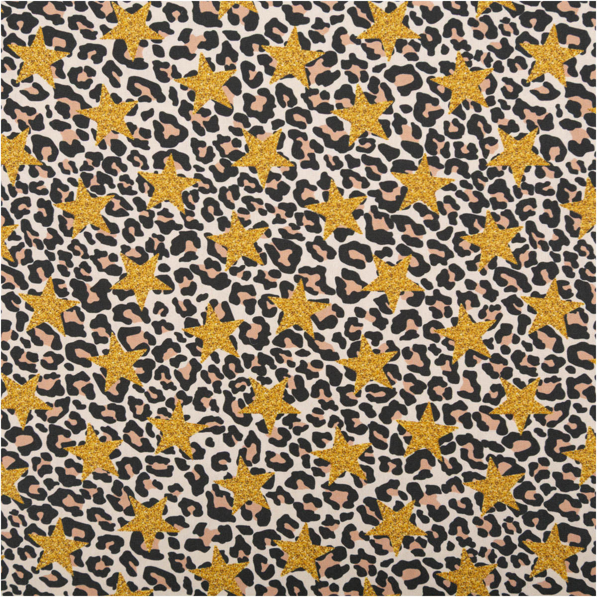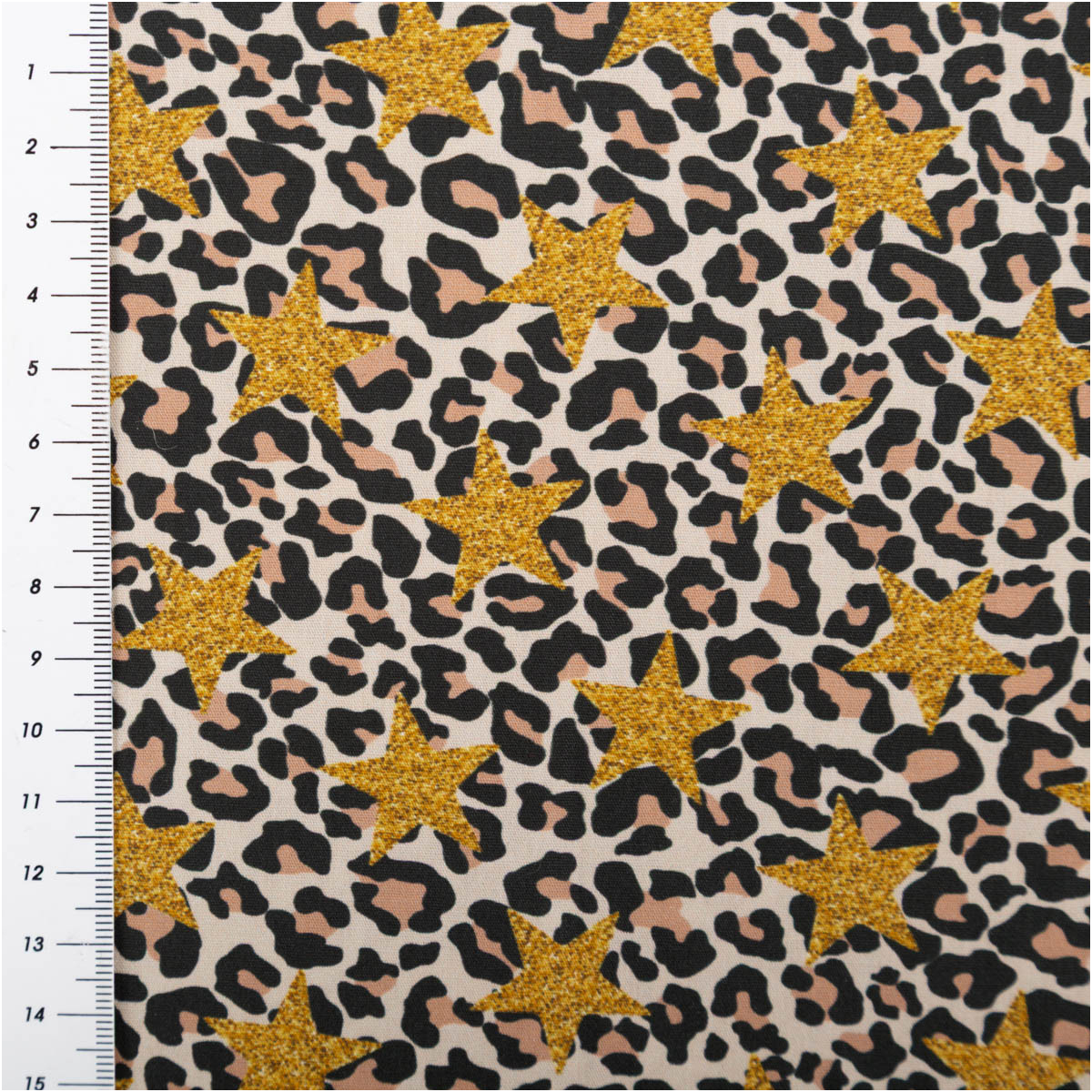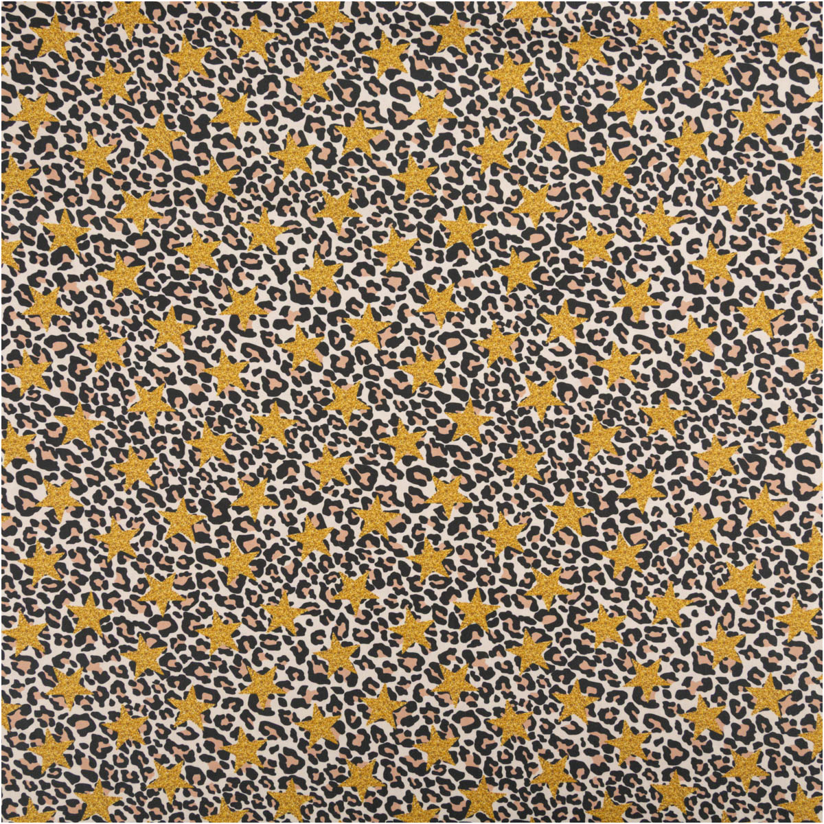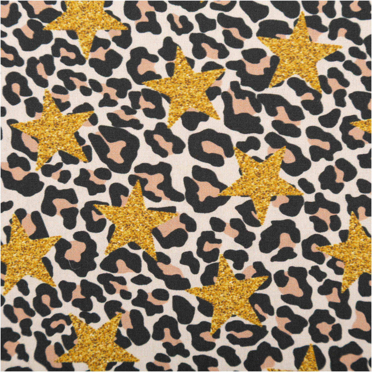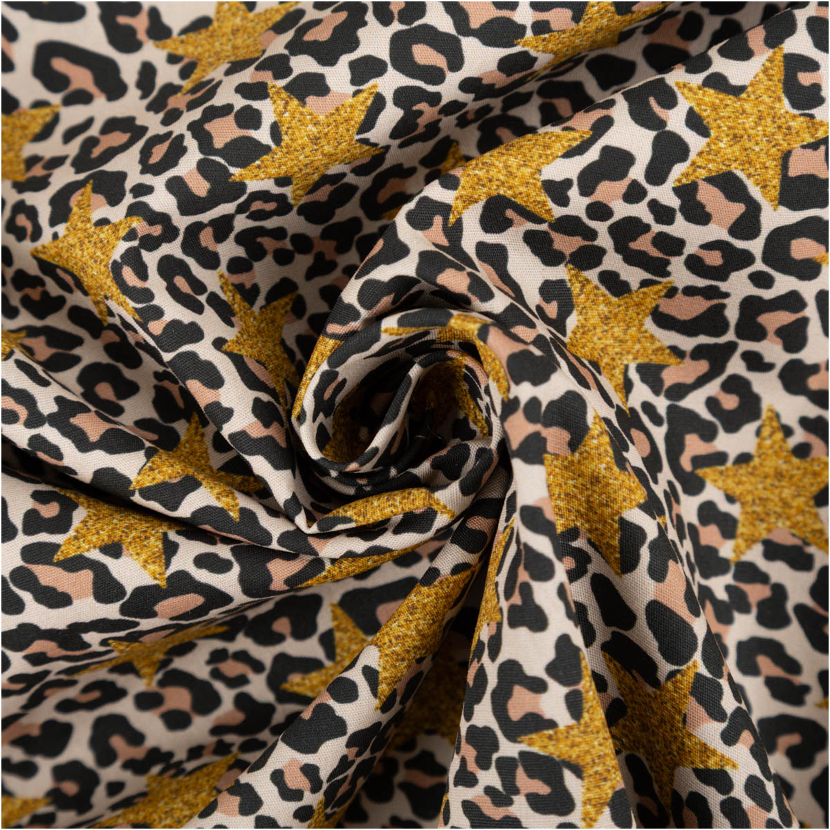 Dieser auffällige Baumwollstoff Popeline bringt Glamour in deine Nähprojekte! Das angesagte Leo-Muster wird durch goldfarbene Glitzer-Sterne perfekt ergänzt und sorgt so für eine trendige Kombination aus wild und festlich.