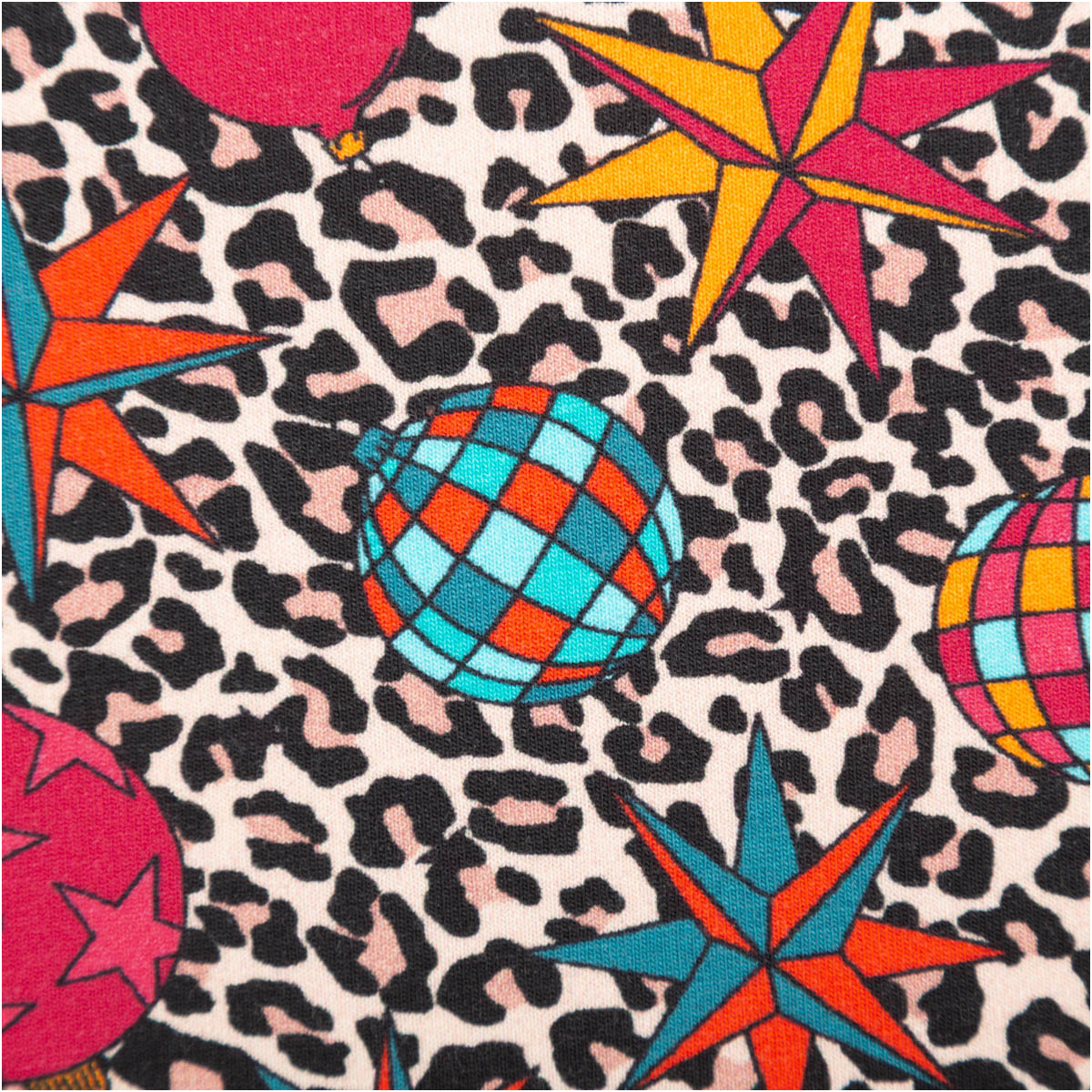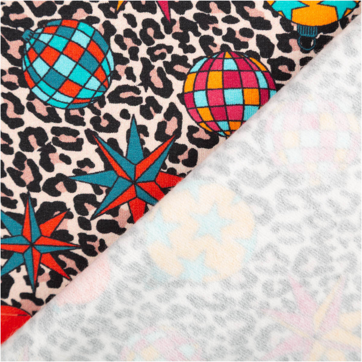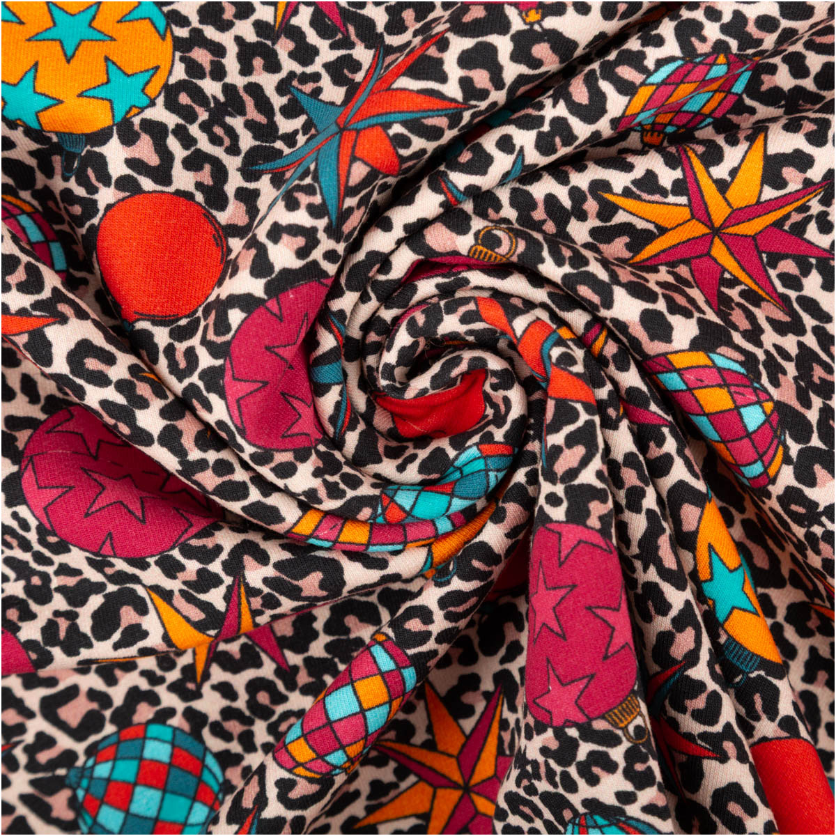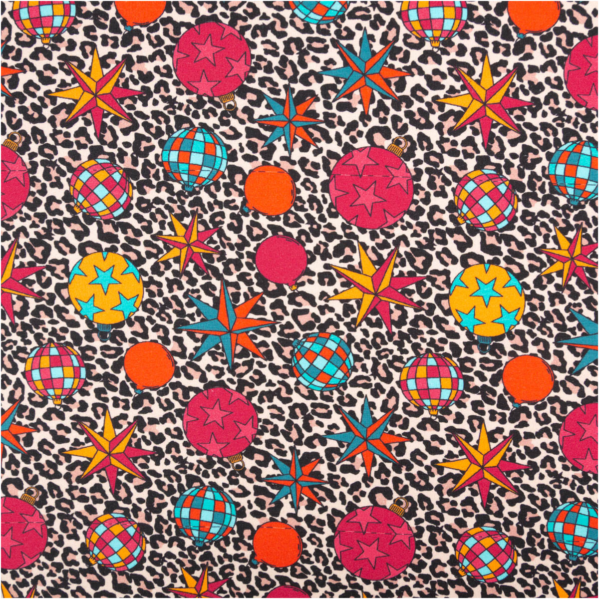 Dieser French Terry (Sommersweat) vereint Leopardenprint mit knalligen Weihnachtskugeln und Sternen – modern, frech und perfekt für außergewöhnliche Weihnachts-Outfits und DIY-Projekte.