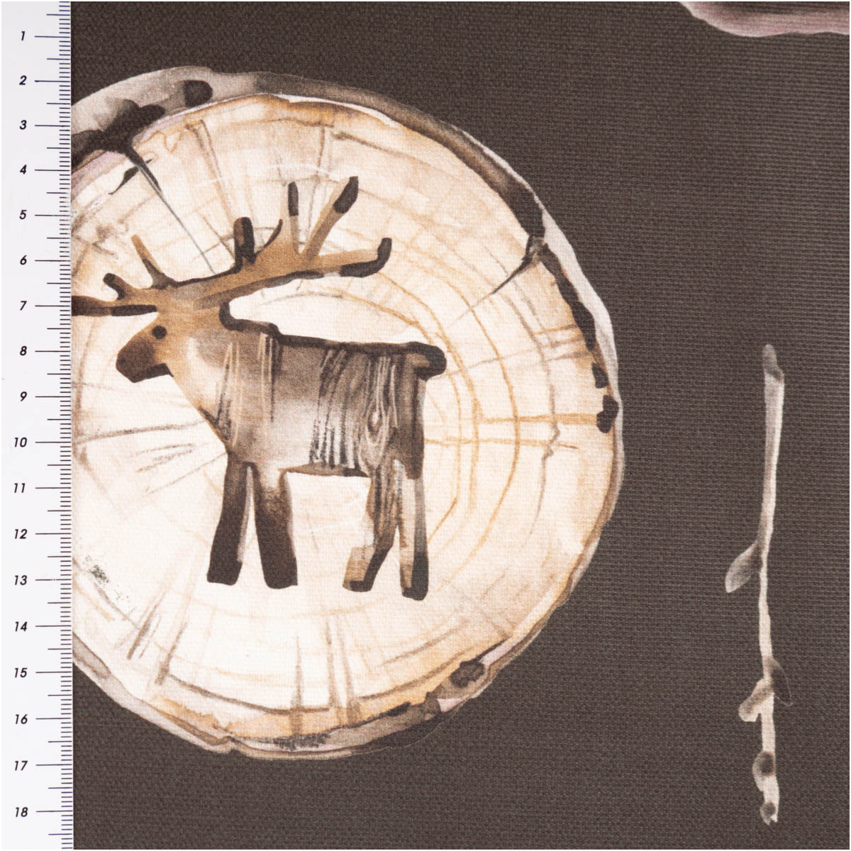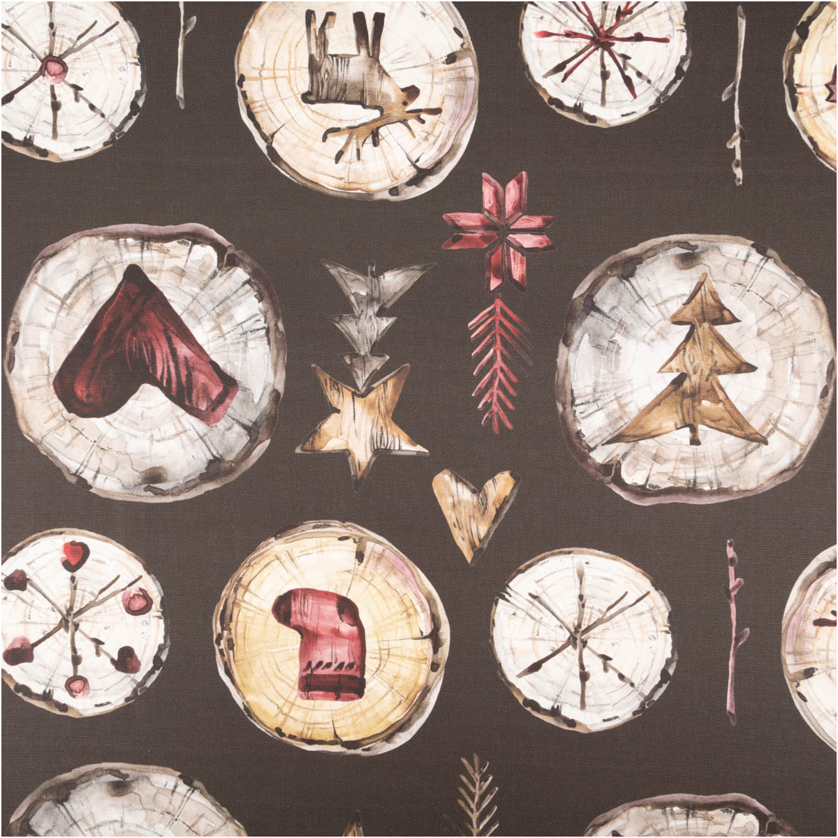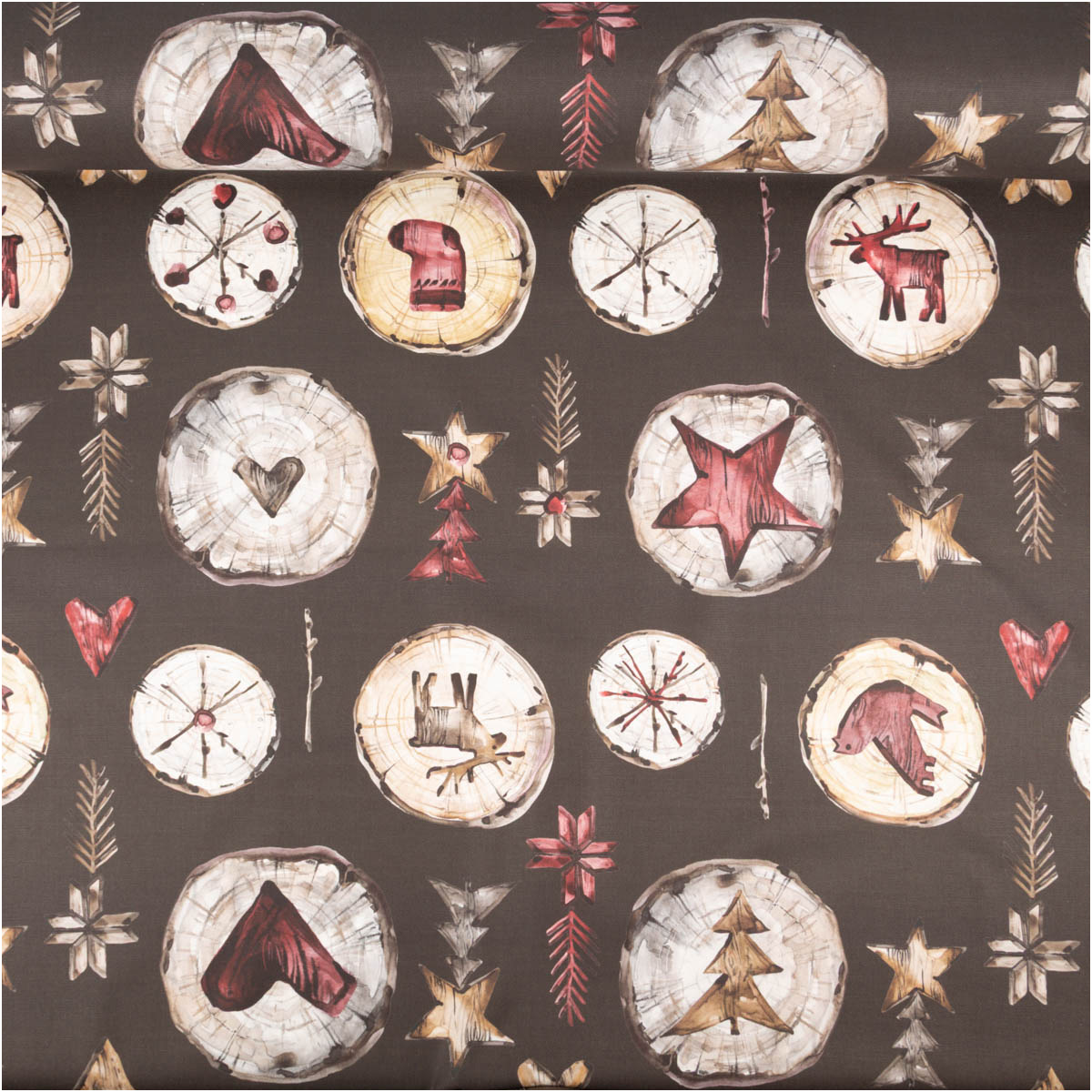 Hochwertiger Baumwollstoff Halbpanama mit Holzscheiben-Motiv, Elchen, Sternen & Herzen in warmen Naturtönen
