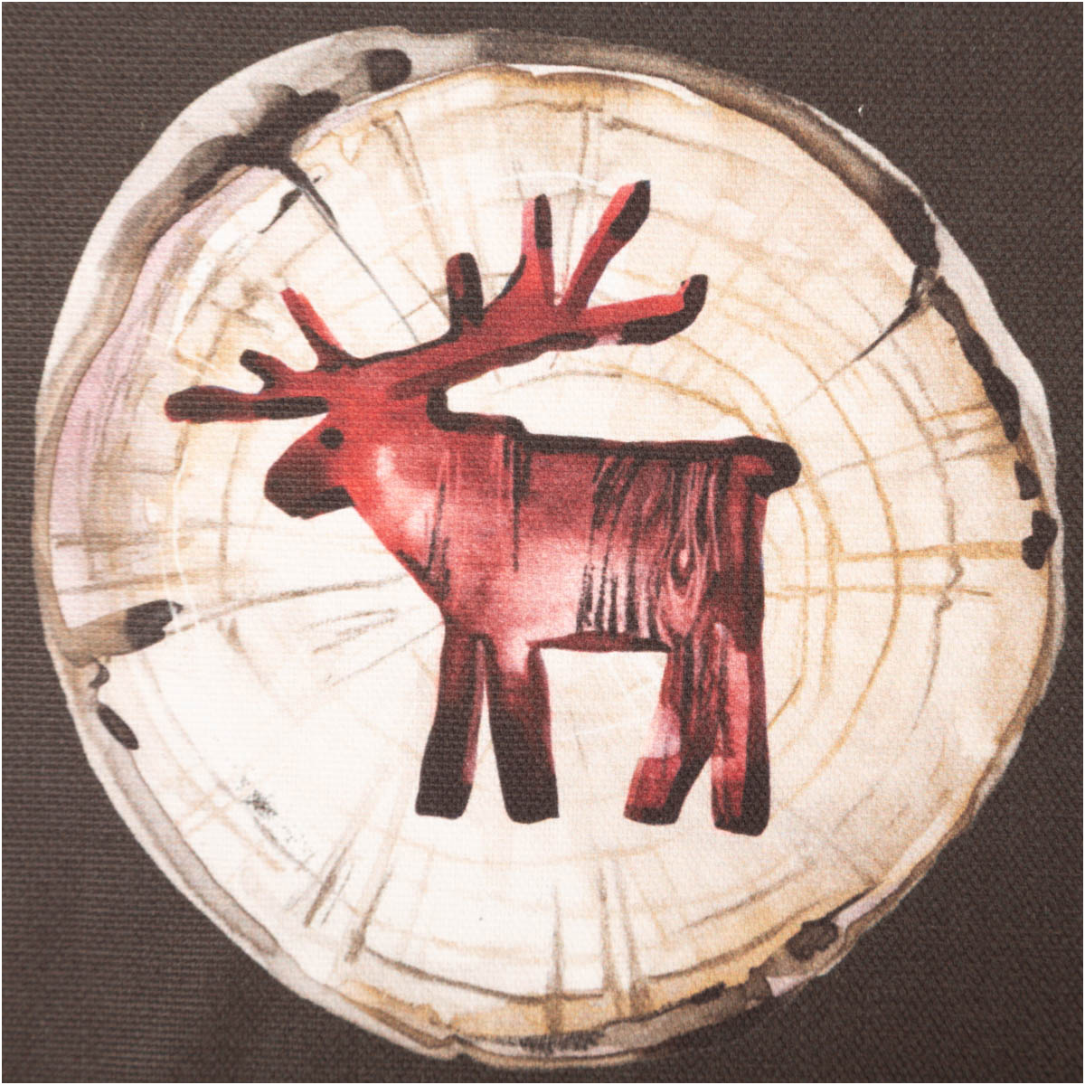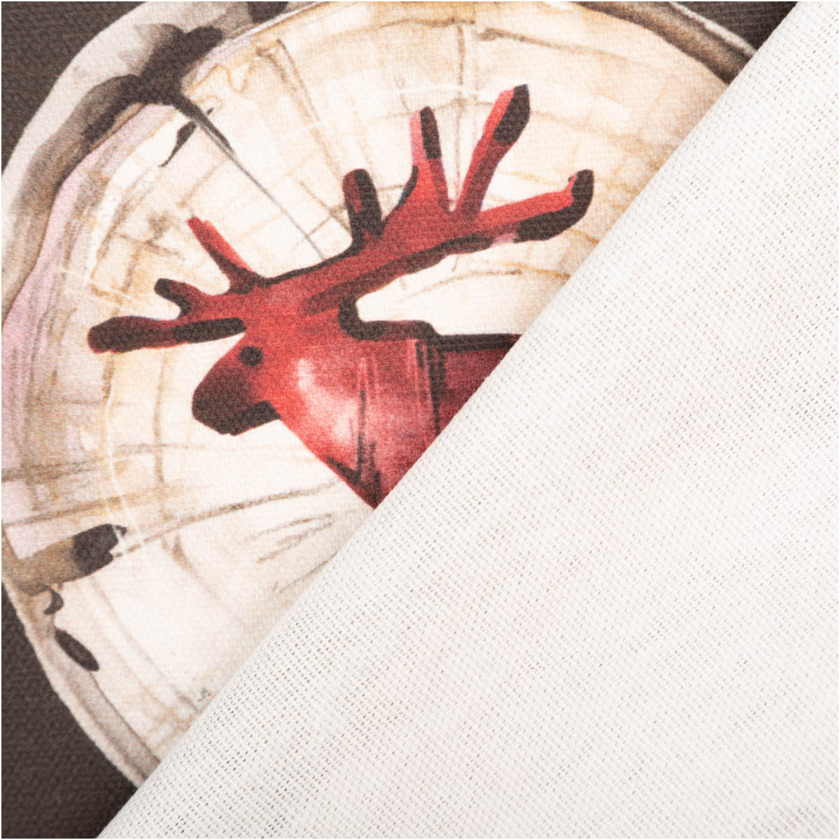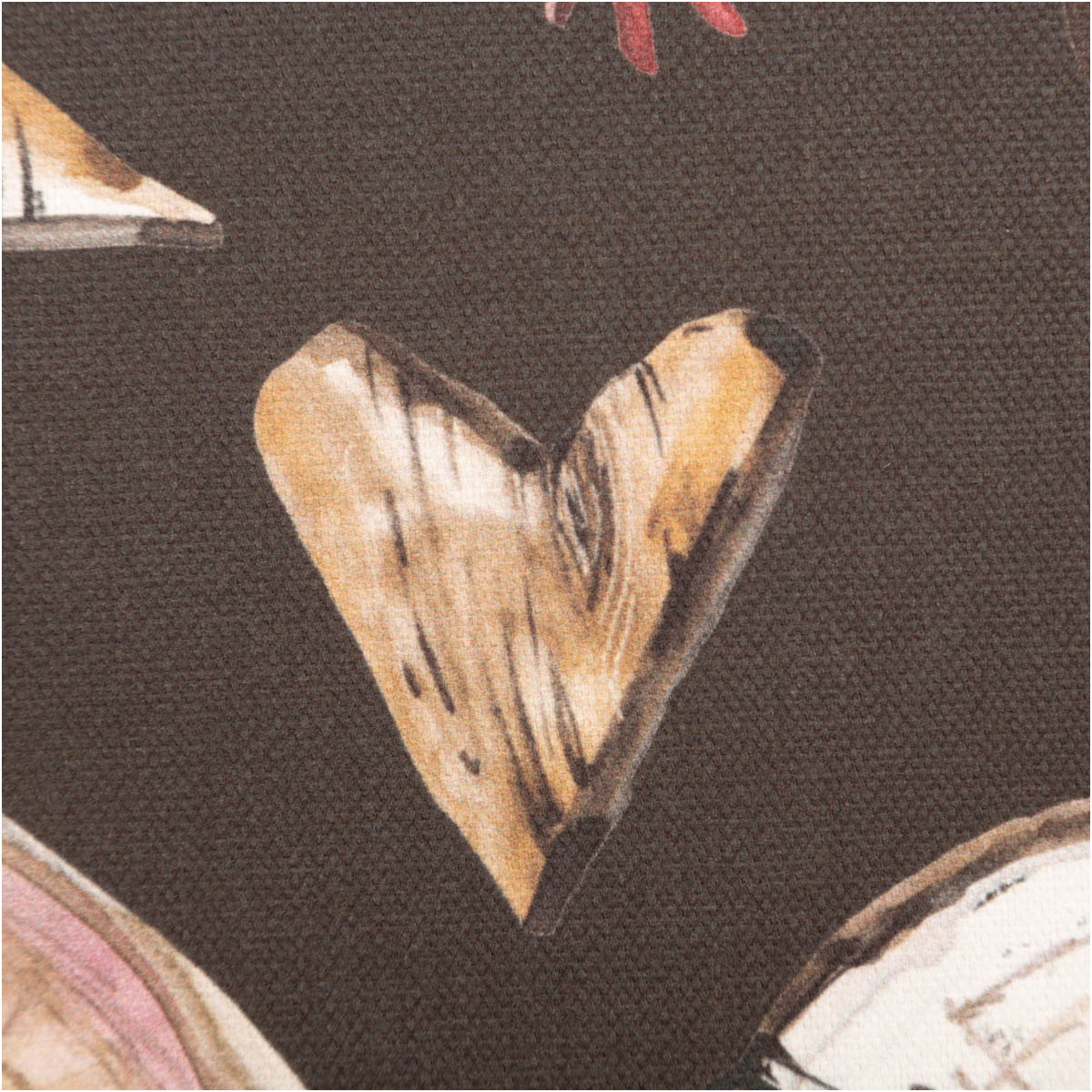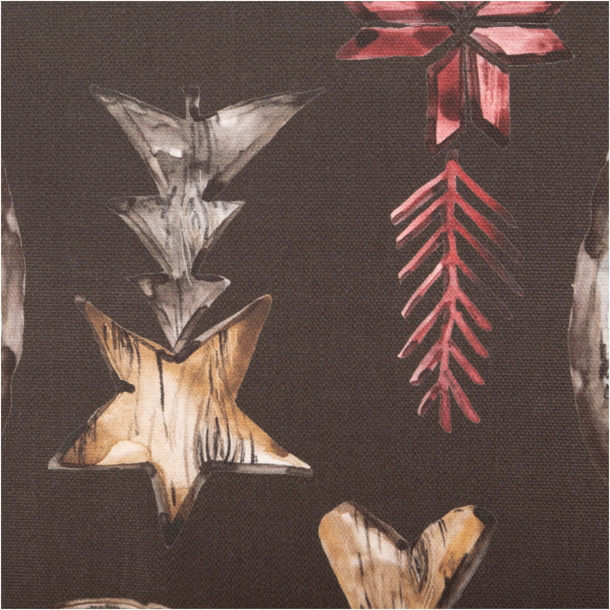 Hochwertiger Baumwollstoff Halbpanama mit Holzscheiben-Motiv, Elchen, Sternen & Herzen in warmen Naturtönen