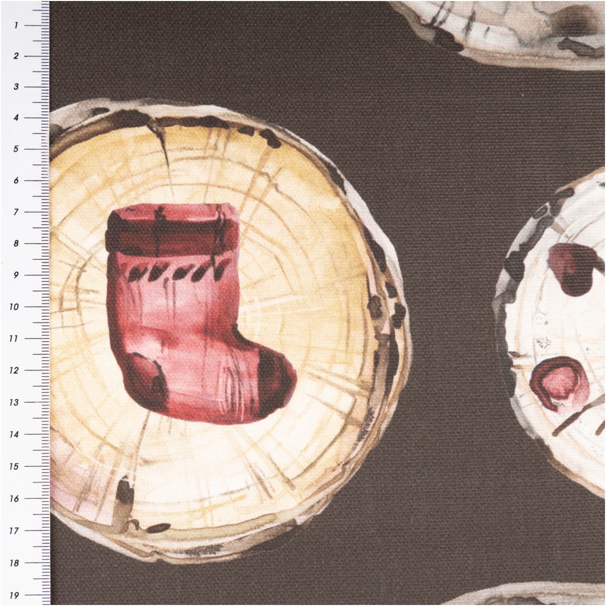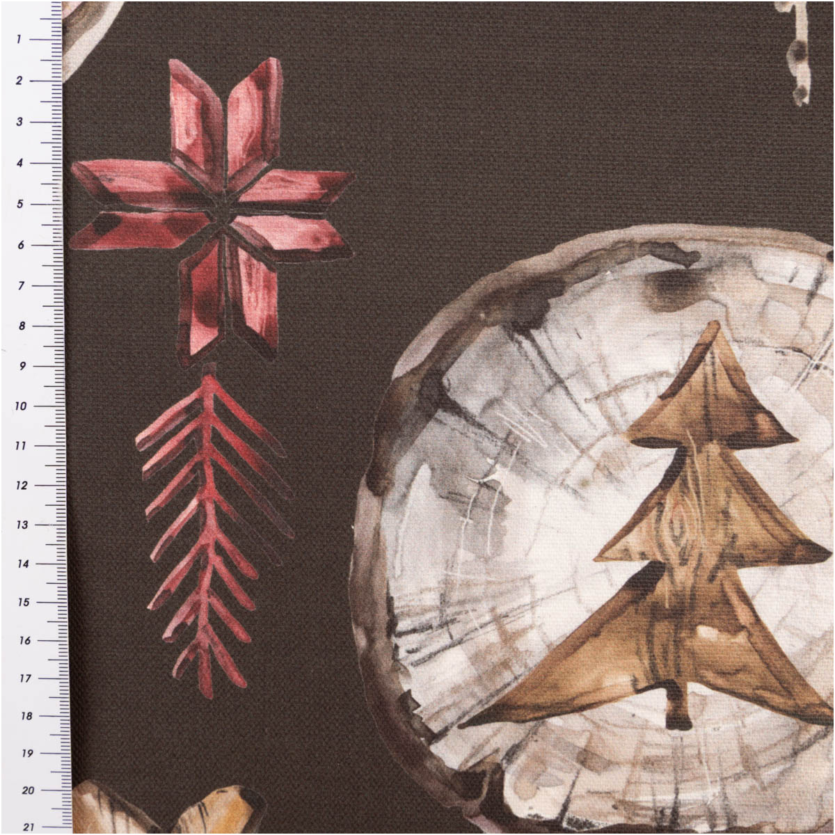 Unser Baumwollstoff Halbpanama Wooden Christmas bringt natürliche Gemütlichkeit und festliche Wärme in dein Zuhause. Das außergewöhnliche Holzscheiben-Design mit Elchen, Sternen, Herzen und Tannenbäumen verleiht deiner Weihnachtsdeko einen rustikalen, modernen Landhaus-Charme.