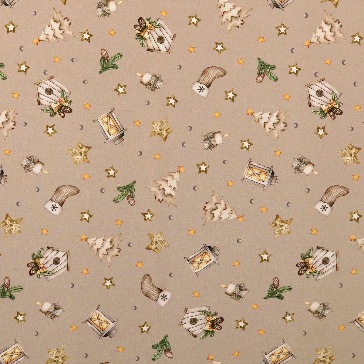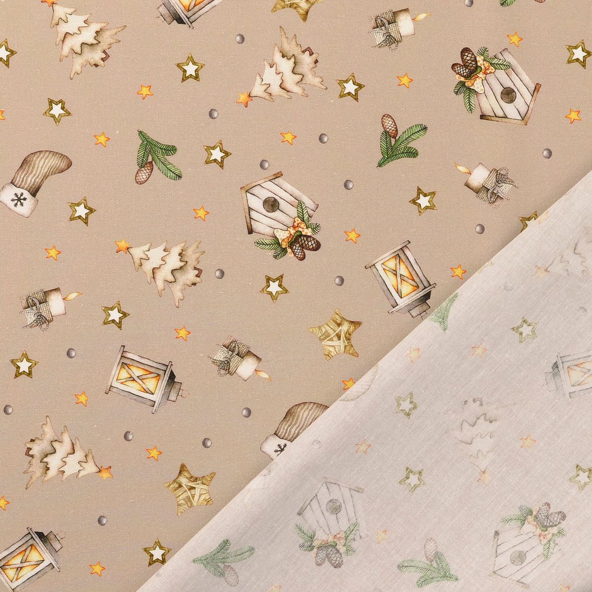 Du suchst einen fein gewebten Baumwollstoff für festliche Projekte? Diese Popeline in dezentem Beige bringt Laternen, Sterne, Tannen, Vogelhäuschen, Zapfen und Mützchen als Allover-Dessin auf deine Nähmaschine – perfekt für Deko, Accessoires und leichte Bekleidung.