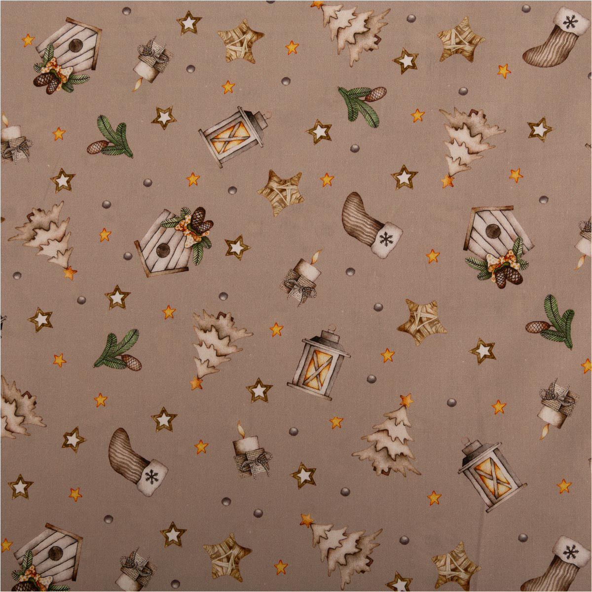 Motiv: Laternen, Sterne, Tannen, Vogelhäuschen, Zweige – Allover