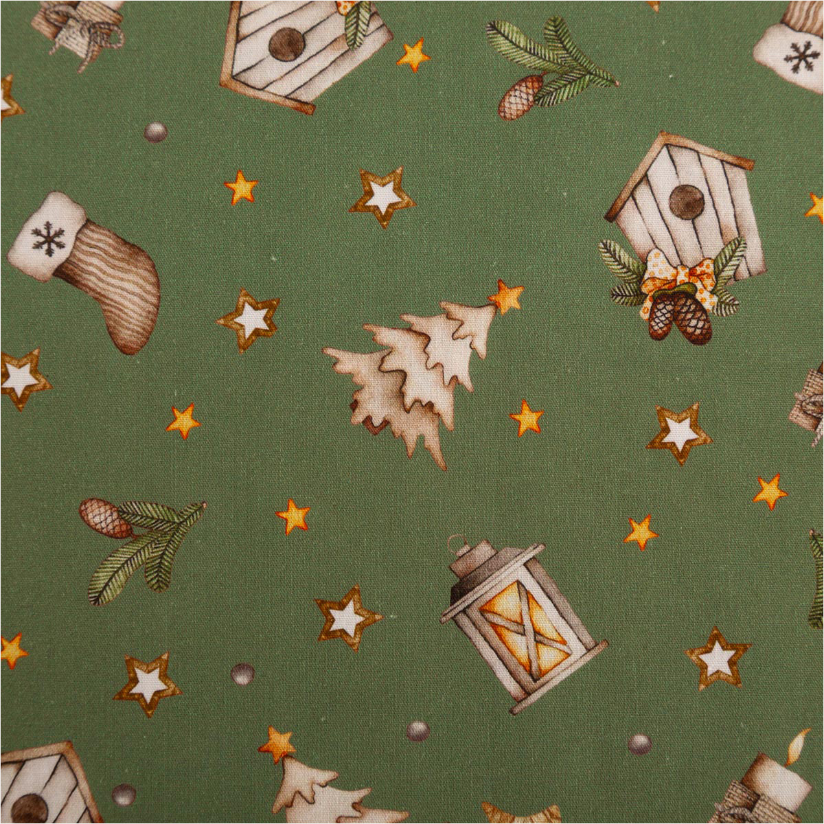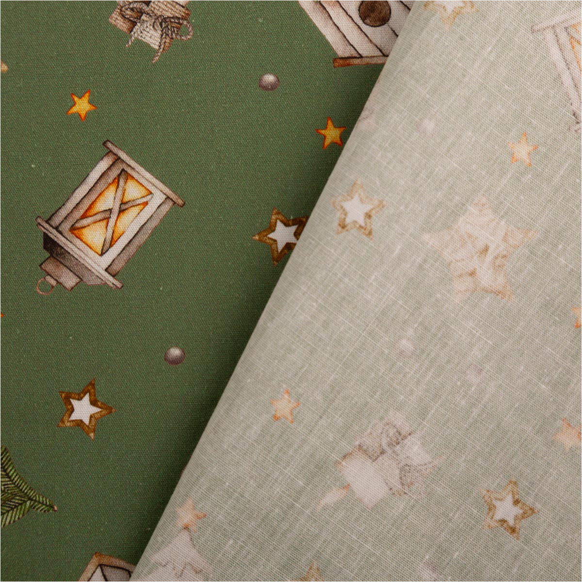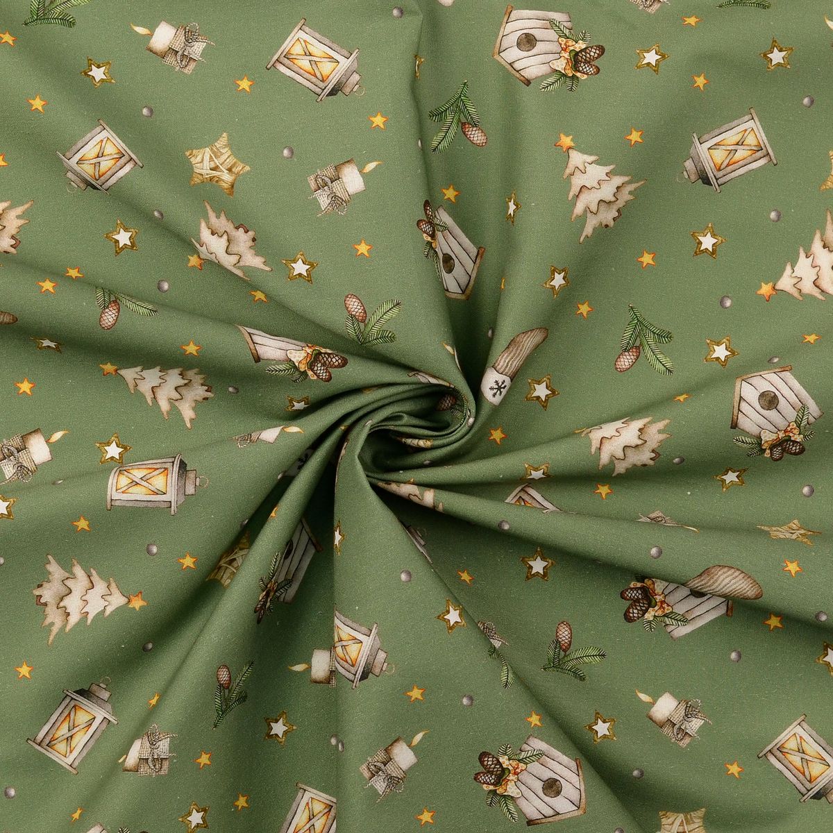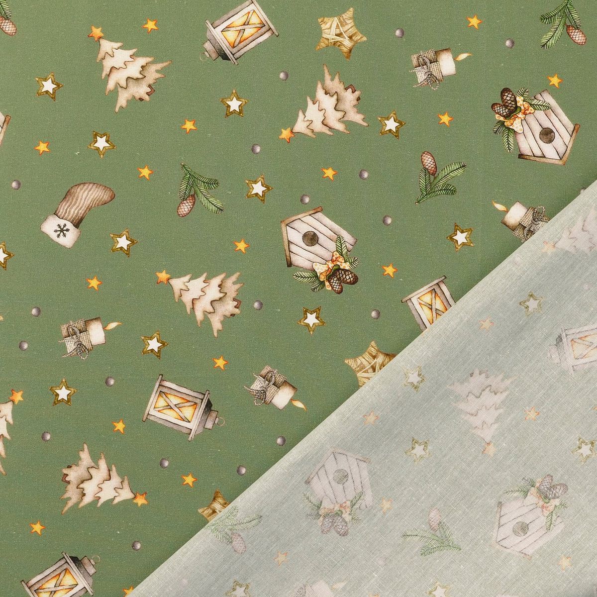 Du suchst einen fein gewebten Baumwollstoff für festliche Projekte? Diese Popeline in zartem Grün-Beige bringt Laternen, Sterne, Tannen, Vogelhäuschen, Zapfen und Mützchen als Allover-Dessin auf deine Nähmaschine – perfekt für Deko, Accessoires und leichte Bekleidung.