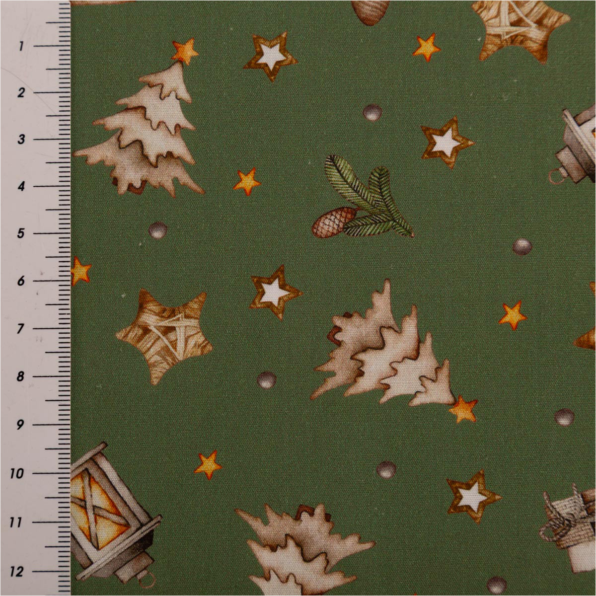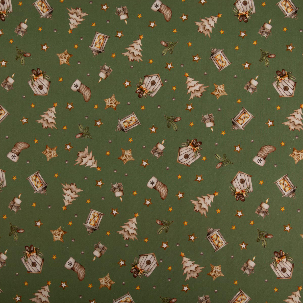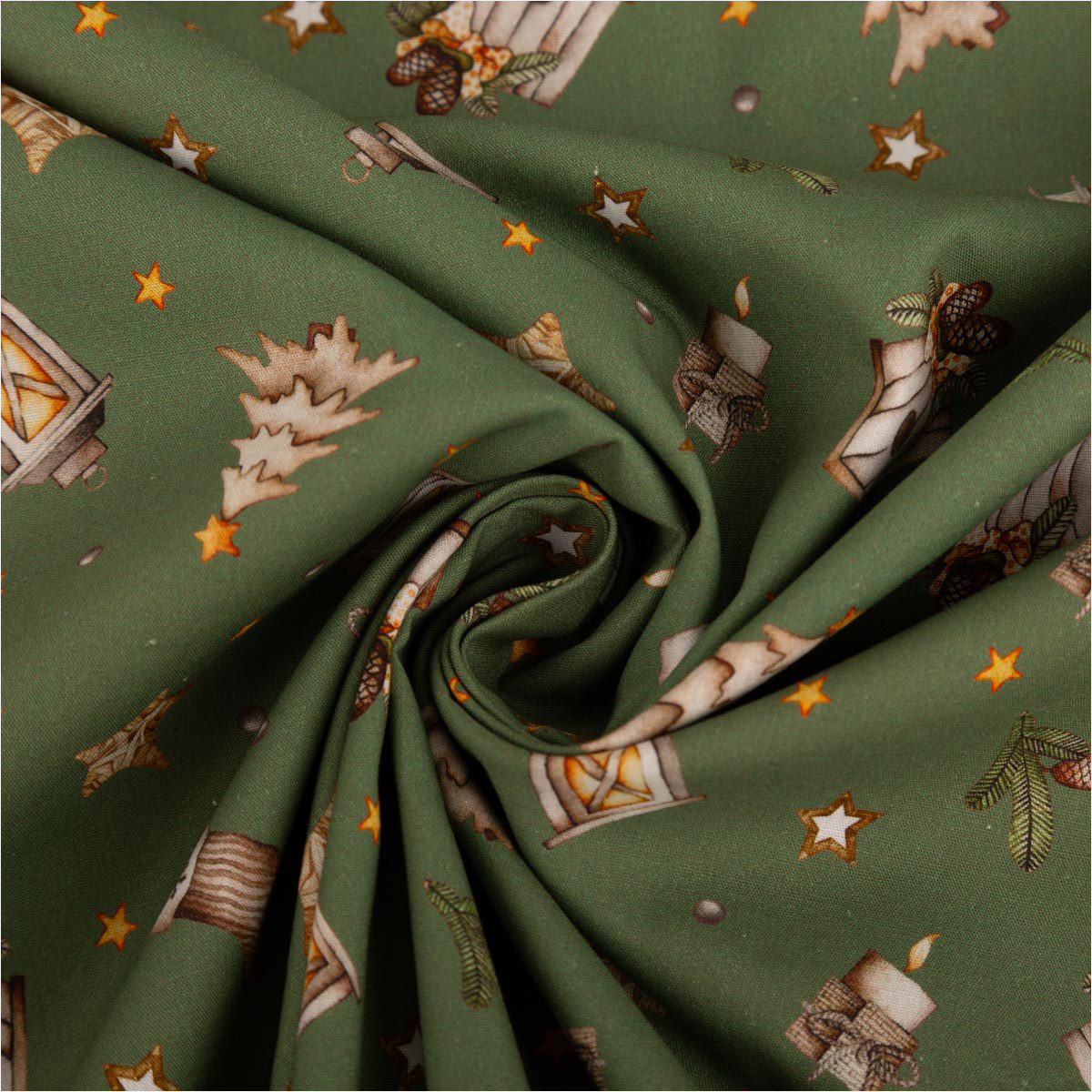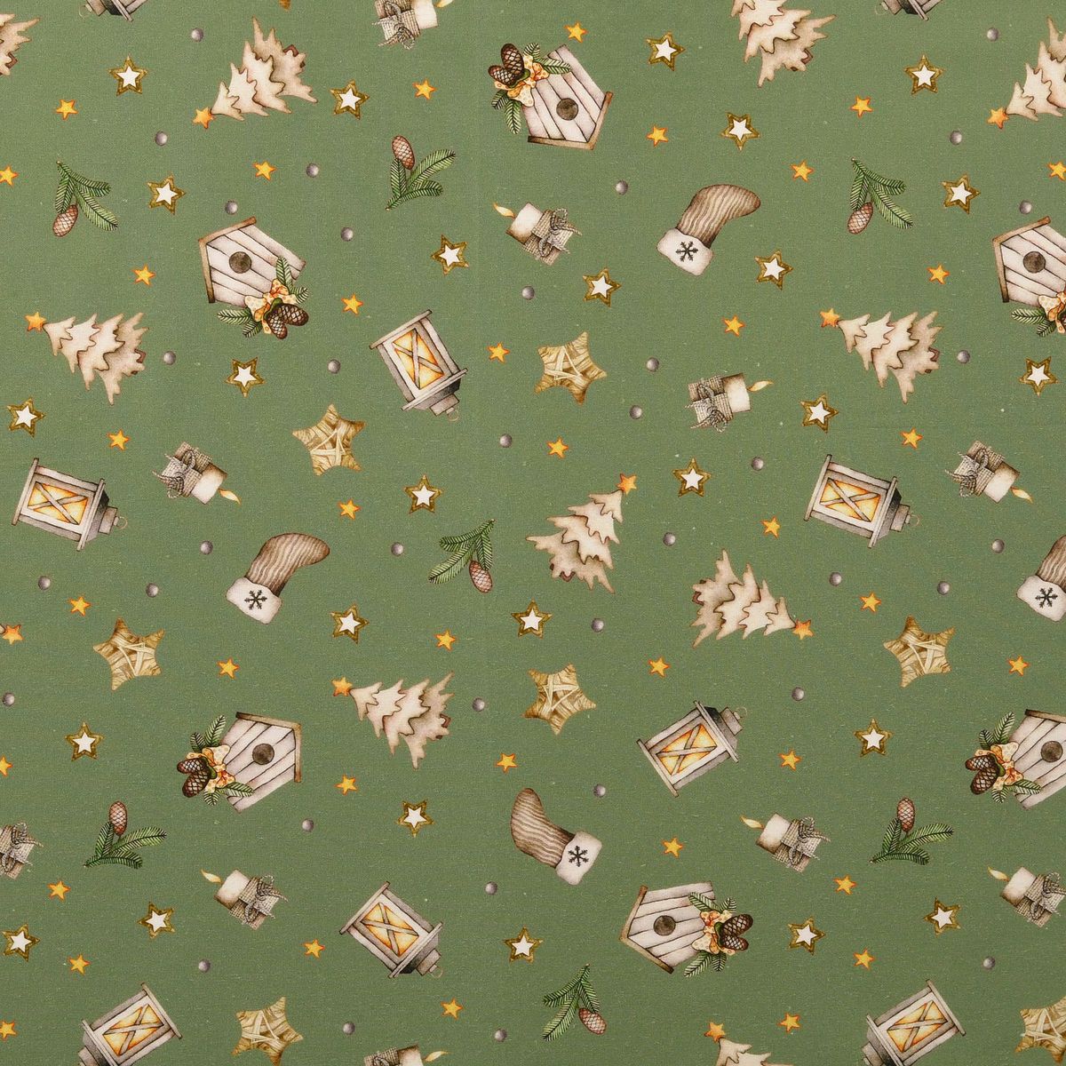 Du suchst einen fein gewebten Baumwollstoff für festliche Projekte? Diese Popeline in zartem Grün-Beige bringt Laternen, Sterne, Tannen, Vogelhäuschen, Zapfen und Mützchen als Allover-Dessin auf deine Nähmaschine – perfekt für Deko, Accessoires und leichte Bekleidung.