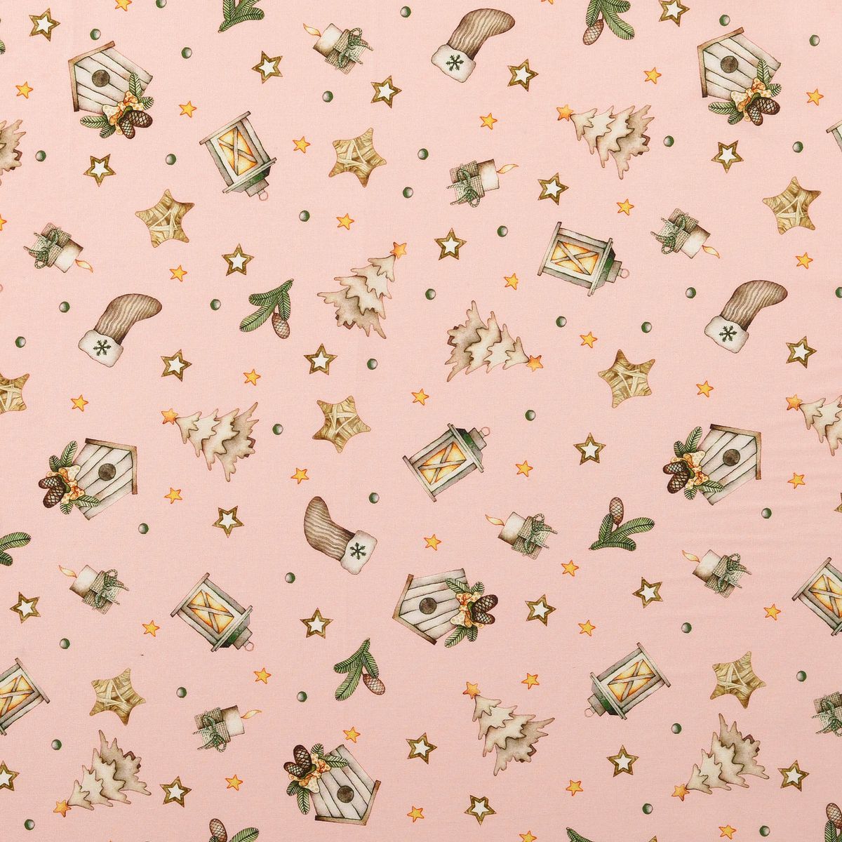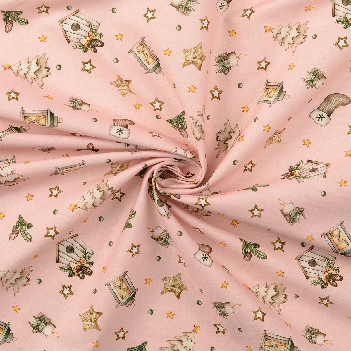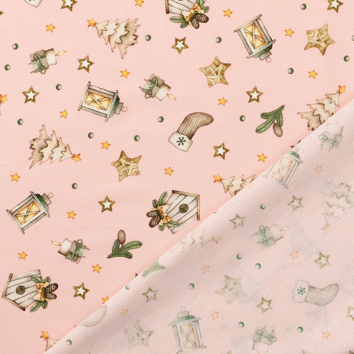 Du suchst einen fein gewebten Baumwollstoff für festliche Projekte? Diese Popeline in zartem Rosa-Beige bringt Laternen, Sterne, Tannen, Vogelhäuschen, Zapfen und Mützchen als Allover-Dessin auf deine Nähmaschine – perfekt für Deko, Accessoires und leichte Bekleidung.