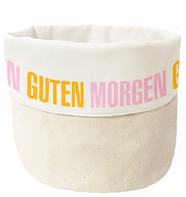 Dieses Stoff-Körbchen von Grafik Werkstatt ist ein echtes Allround-Talent: Du nutzt es als Brotkorb für Brötchen und Croissants oder als praktisches Utensilo für Krimskrams, Kosmetik und Schreibtischkram. Der naturfarbene Baumwollstoff wirkt angenehm ruhig, der „Guten Morgen“-Schriftzug in Rosa und Gelb setzt einen frischen Akzent.