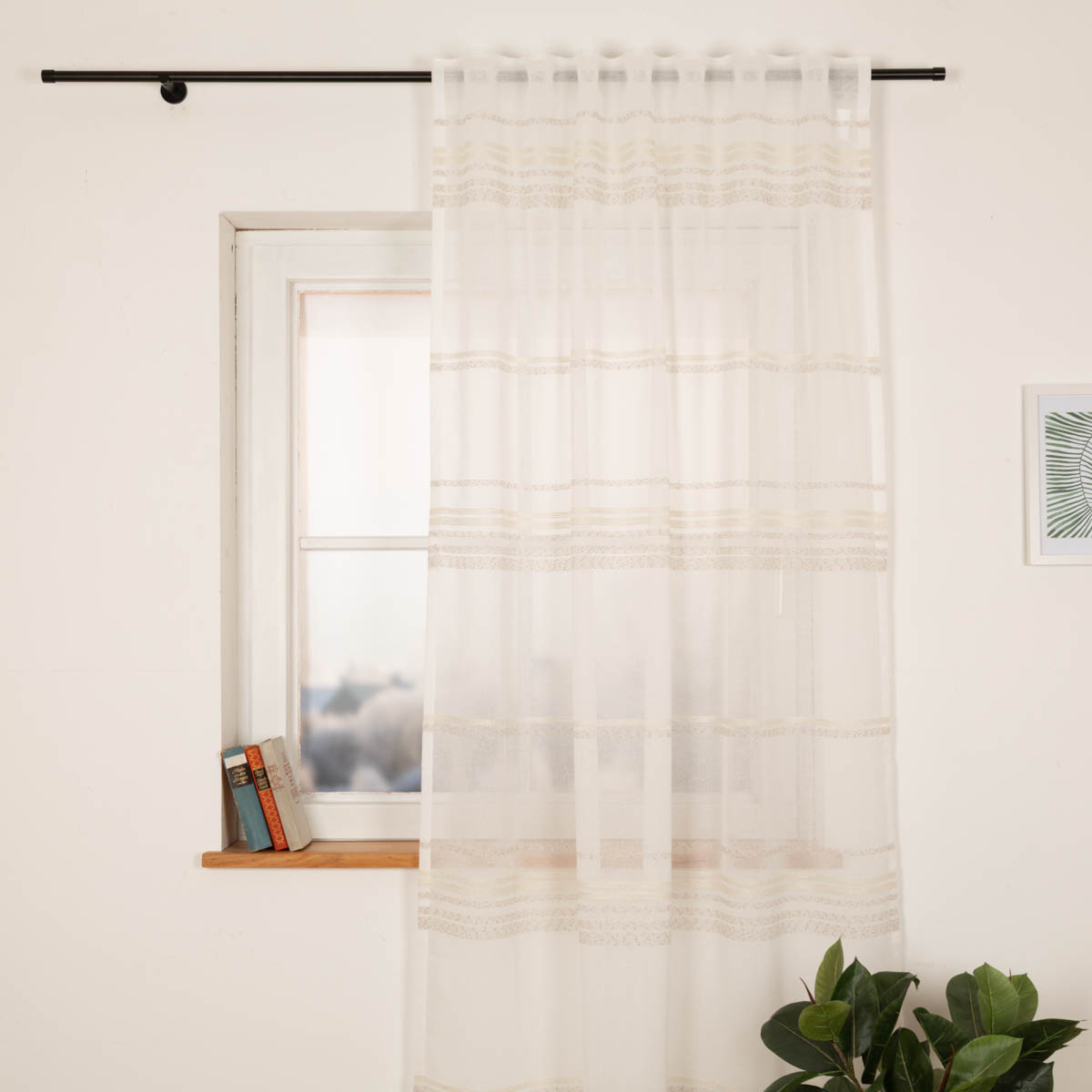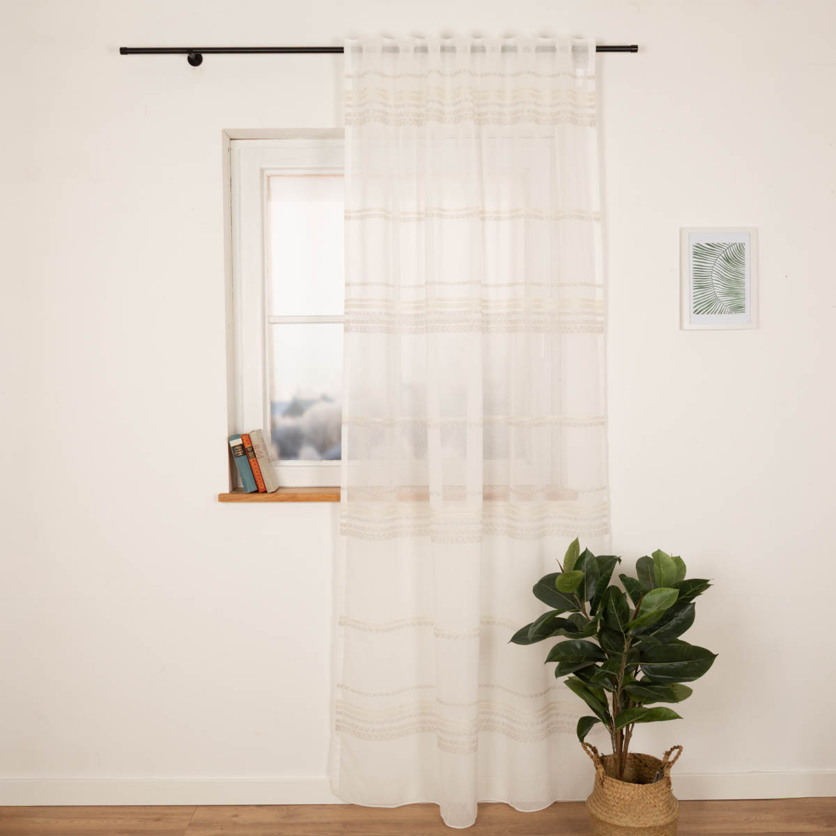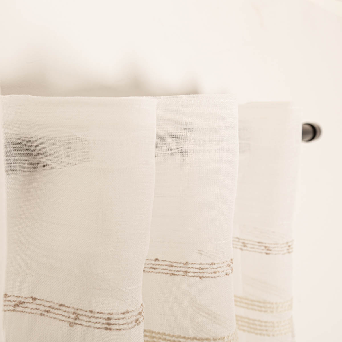 Diese Gardine aus transparentem Voile bringt ein ruhiges, natürliches und lichtdurchflutetes Ambiente in dein Zuhause. Die eingewebten naturfarbenen Bouclé-Streifen verleihen dem Stoff eine feine, rustikale Struktur, die perfekt zu modernen, skandinavischen und natürlichen Wohnstilen passt. Der wollweiße Voile sorgt für einen sanften Lichteinfall und bietet gleichzeitig einen leichten Sicht- und Blendschutz – ideal für Wohn-, Ess- oder Schlafzimmer.