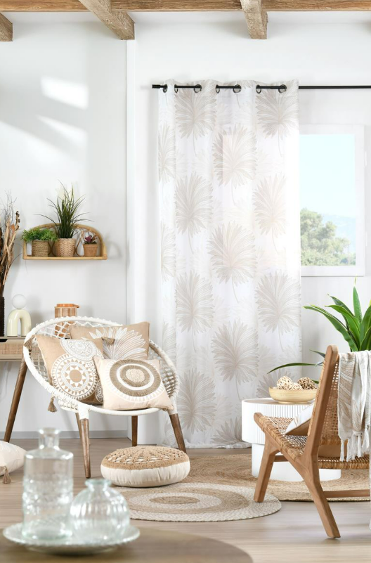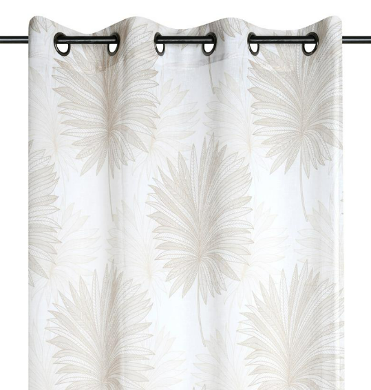 Dieser transparente Ösenvorhang aus feinem Voile bringt Leichtigkeit und Eleganz in deine Wohnräume. Das exklusive französische Dessin mit stilisierten Palmenblättern und Ornamenten wirkt modern, natürlich und dekorativ zugleich. Durch die helle Farbgebung in Weiß und Natur bleibt der Raum lichtdurchflutet und erhält eine freundliche, offene Atmosphäre. Ideal für Wohn- und Esszimmer, Schlafzimmer oder helle Arbeitsbereiche.