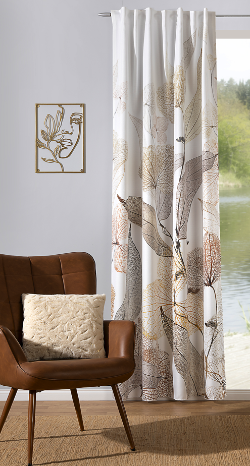 Das Muster aus Blättern in Grün- und Brauntönen auf hellem Untergrund bringt eine natürliche Leichtigkeit an dein Fenster. Die Kombination aus Weiß, Grün und Braun wirkt freundlich, warm und zeitlos. So lässt sich der Vorhang vielseitig kombinieren und fügt sich gut in unterschiedliche Wohnkonzepte ein.
