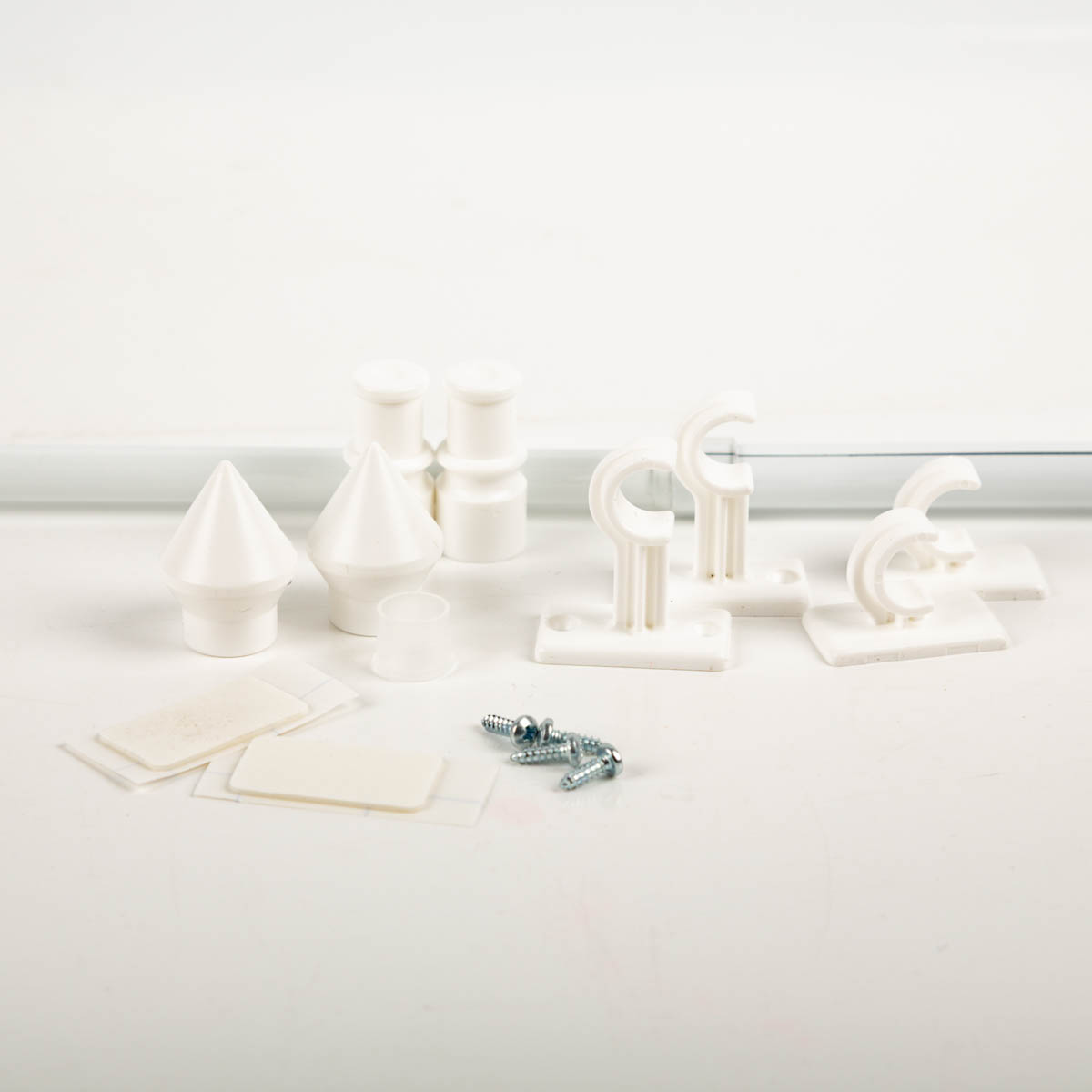 Enthalten sind einmal kurze Träger (für Scheibengardinen mit Tunnel) und einmal lange Träger für Dekorationen mit Wellen. Die Träger kannst du entweder aufkleben oder anbohren.
