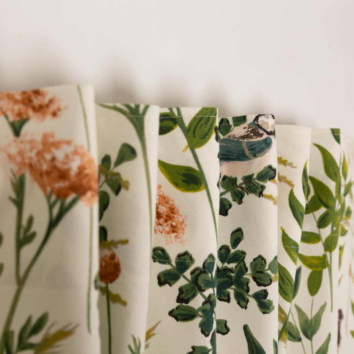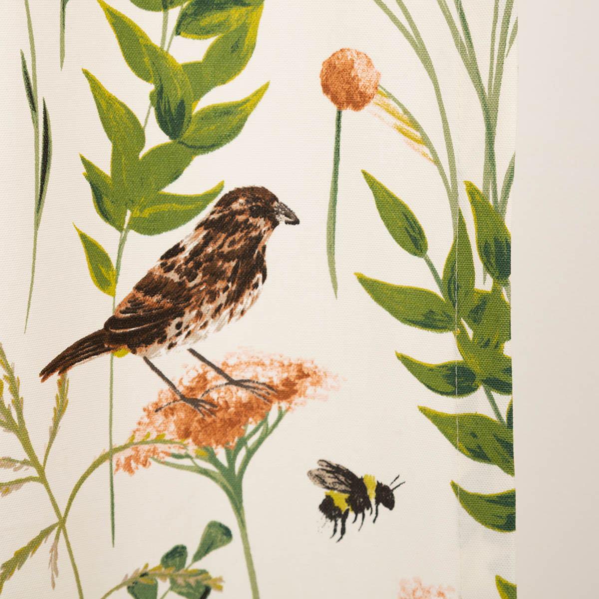 Auf dem hellen Untergrund kommen die liebevoll und detailreich gezeichneten Vögel, Insekten, Gräser und Blumen dank Digitaldruck wunderschön zur Geltung.
