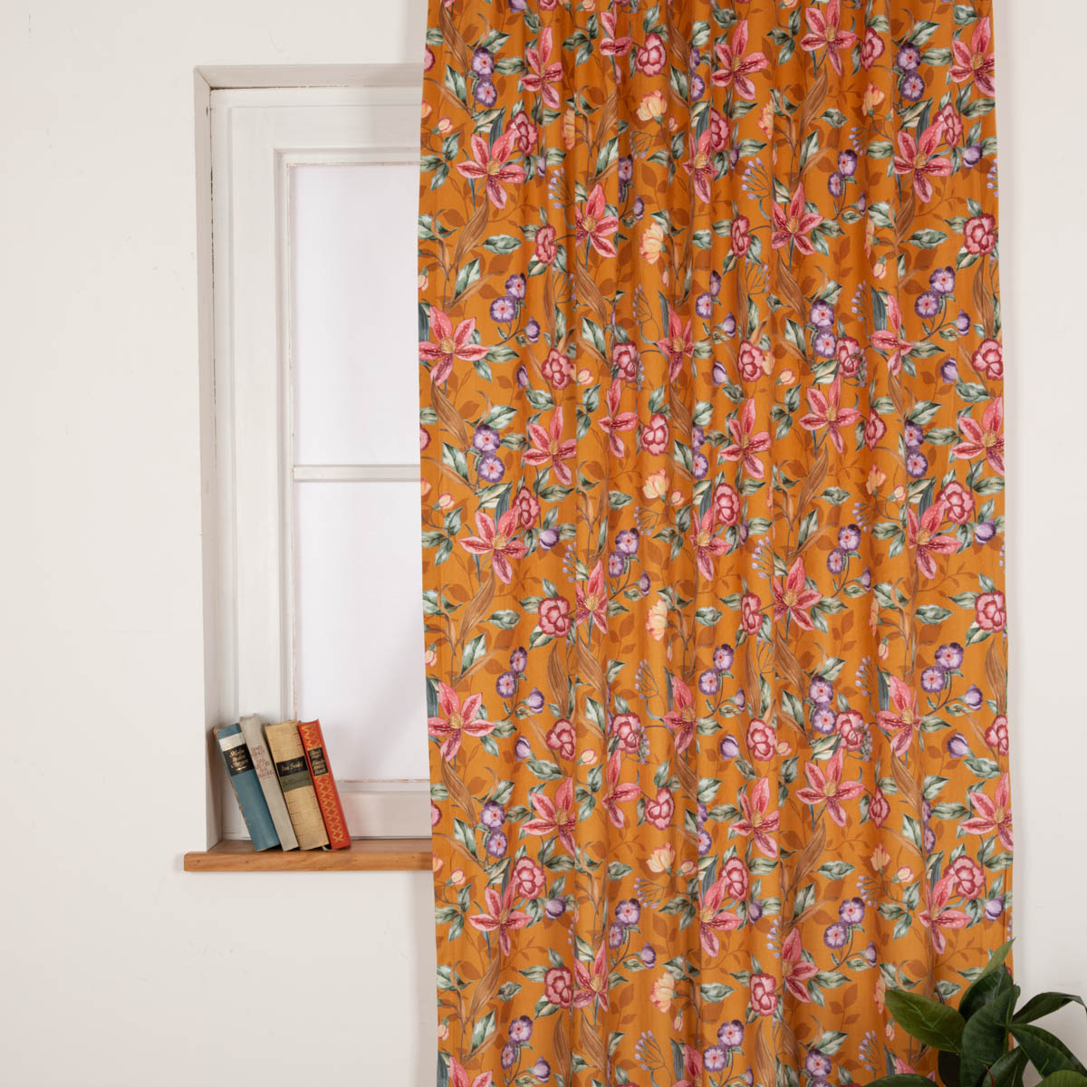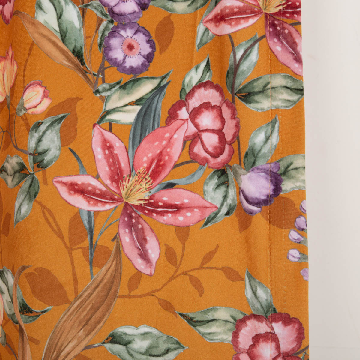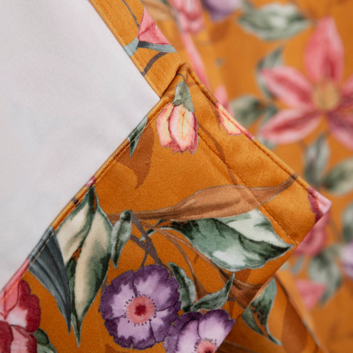 Extravagantes Digitaldruck-Motiv mit bunten Blüten auf ockergelbem Grund – ein echter Blickfang für dein Zuhause