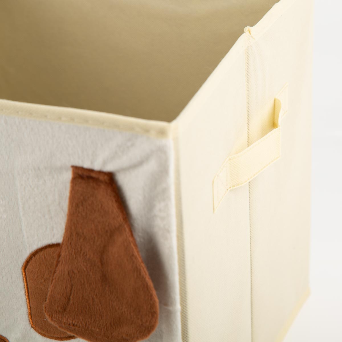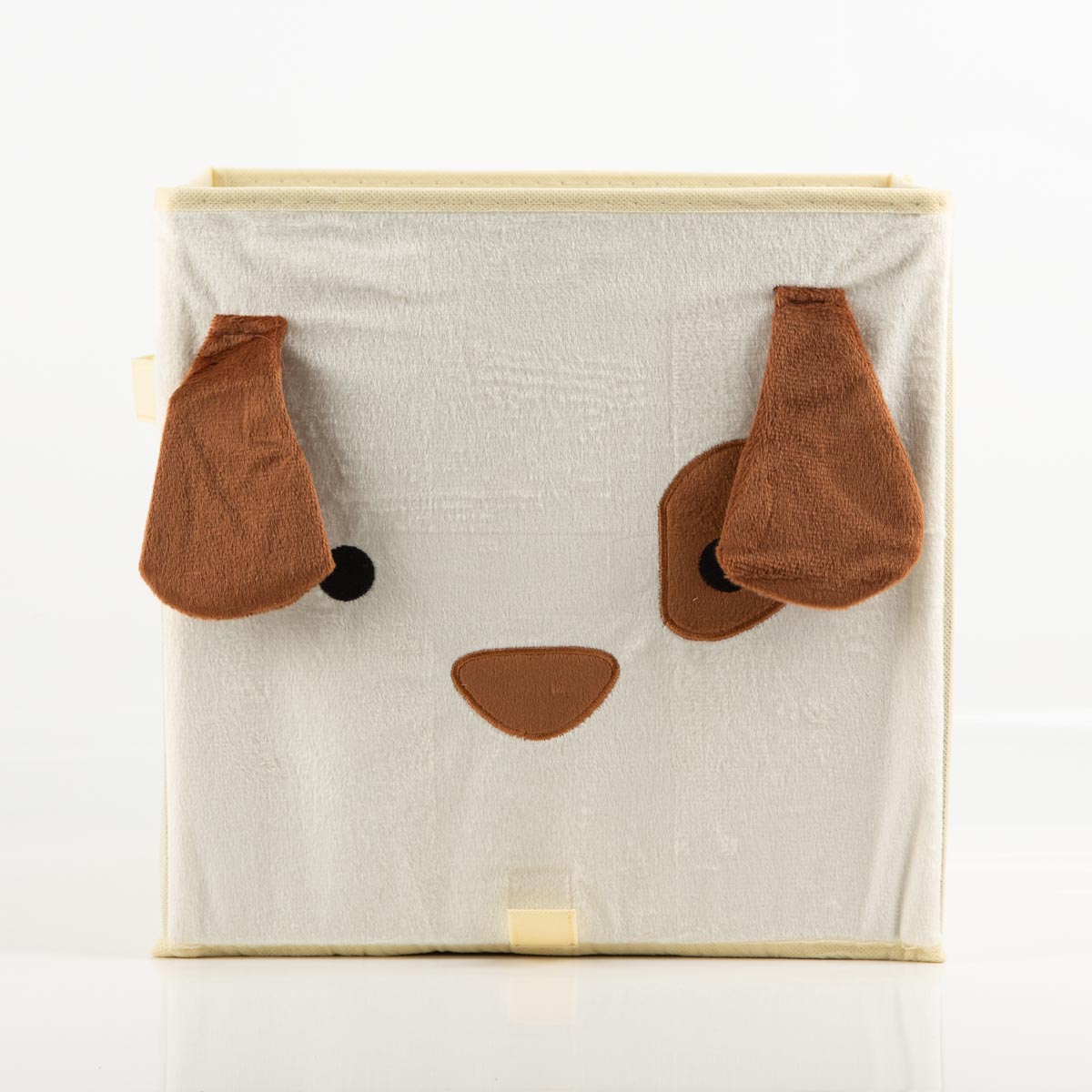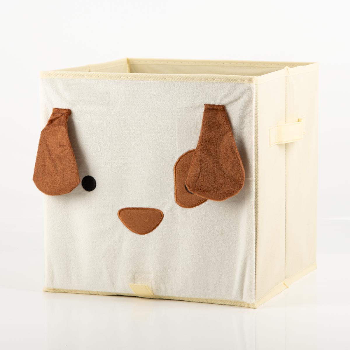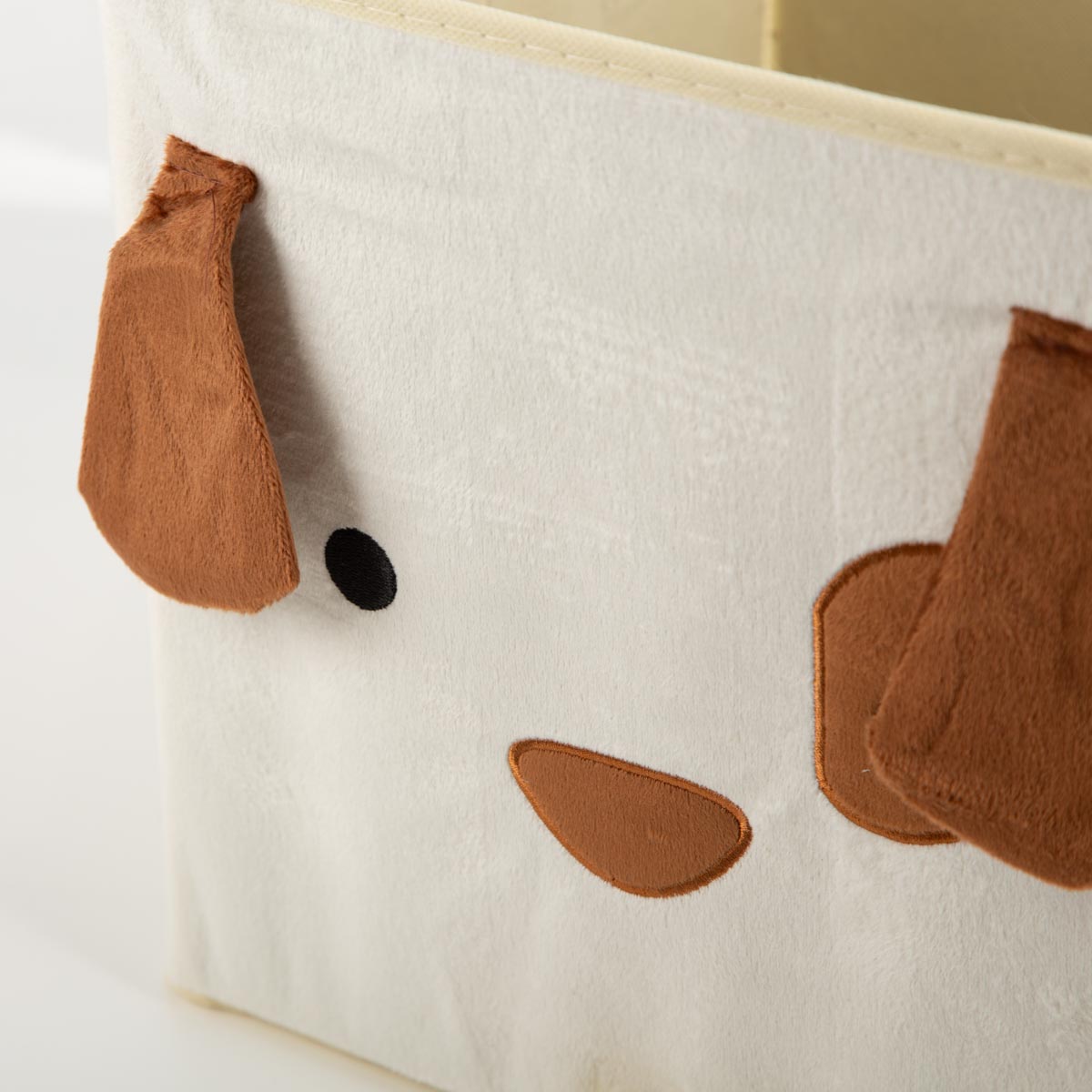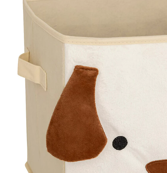 Diese schöne Aufbewahrungsbox bringt sofort gute Laune ins Kinderzimmer. Die Vorderseite zeigt ein liebevoll gestaltetes Hundegesicht aus weichem, samtigem Stoff, während die Seiten glatt und schlicht in hellem Beige gehalten sind. Perfekt, wenn du spielerisches Design mit einer ordentlichen, modernen Optik kombinieren möchtest.