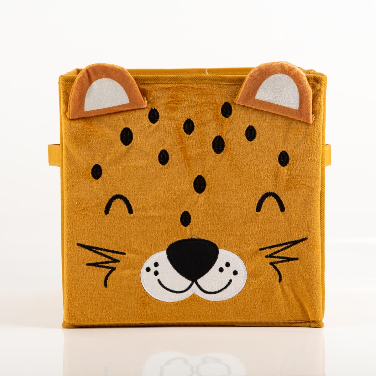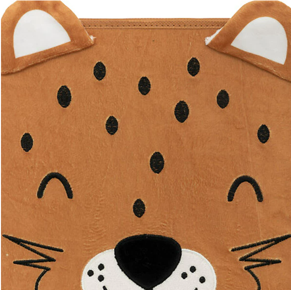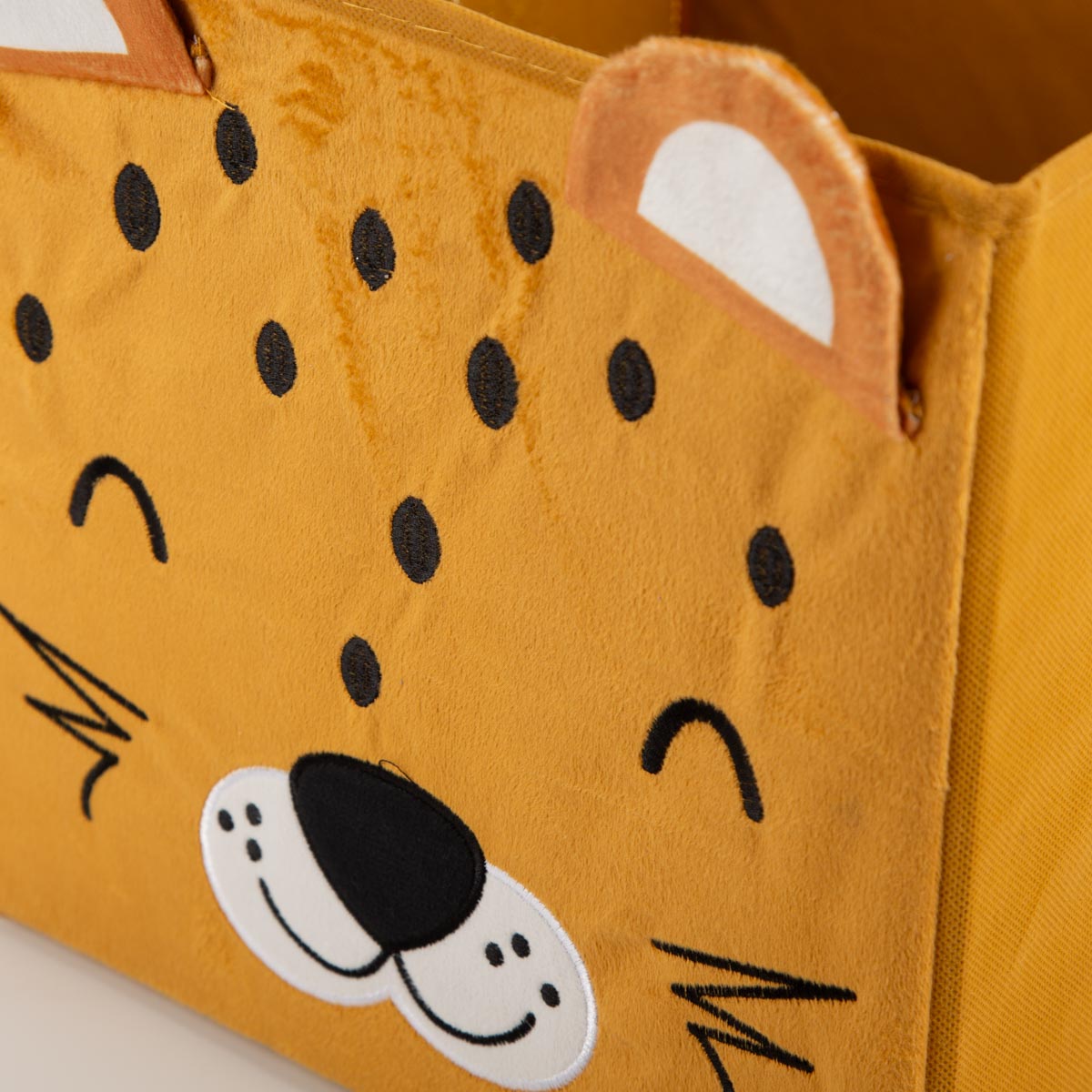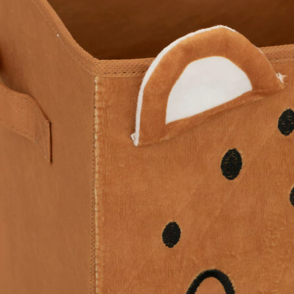 Diese schöne Aufbewahrungsbox bringt sofort gute Laune ins Kinderzimmer. Die Vorderseite zeigt ein liebevoll gestaltetes Löwengesicht aus weichem, samtigem Stoff, während die Seiten glatt und schlicht braun gehalten sind. Perfekt, wenn du spielerisches Design mit einer ordentlichen, modernen Optik kombinieren möchtest.