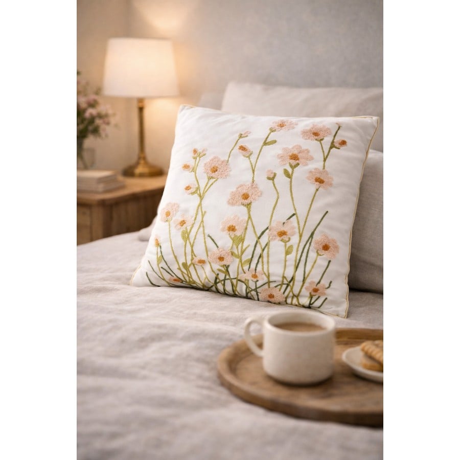 Die Vorderseite macht dieses Dekokissen zu etwas Besonderem. Zarte rosa Blüten treffen auf grüne Stiele und Blätter, die durch Stickerei und Tuftung plastisch hervorgehoben werden. So wirkt das florale Motiv lebendig und hochwertig, ohne unruhig zu erscheinen.