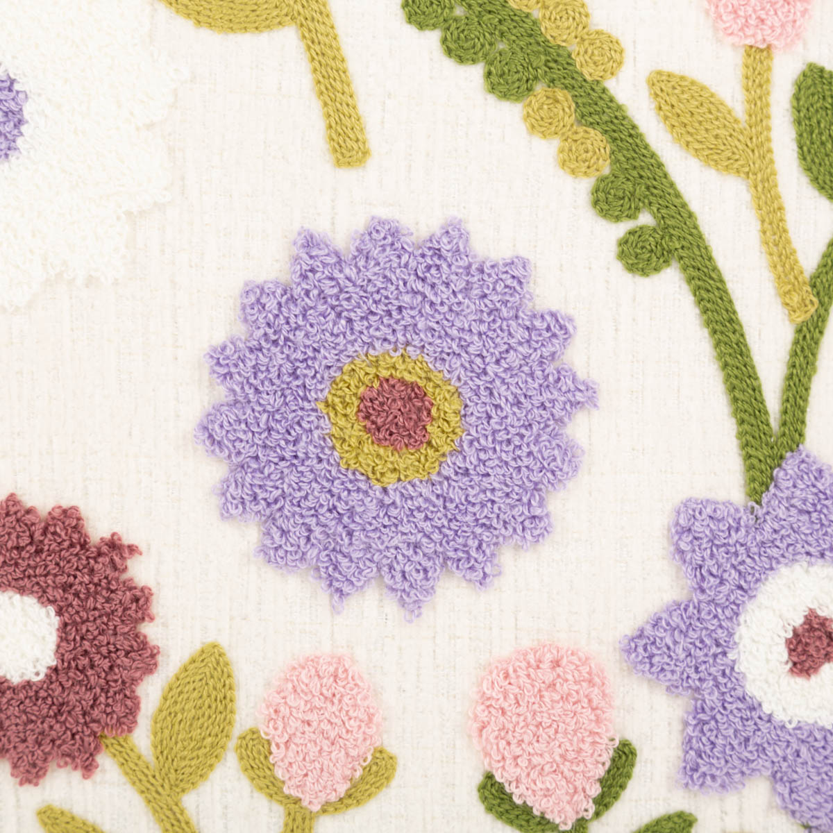 Kissen Blumen aus Chenille in Wollweiß, Grün, Rosa und Lila
