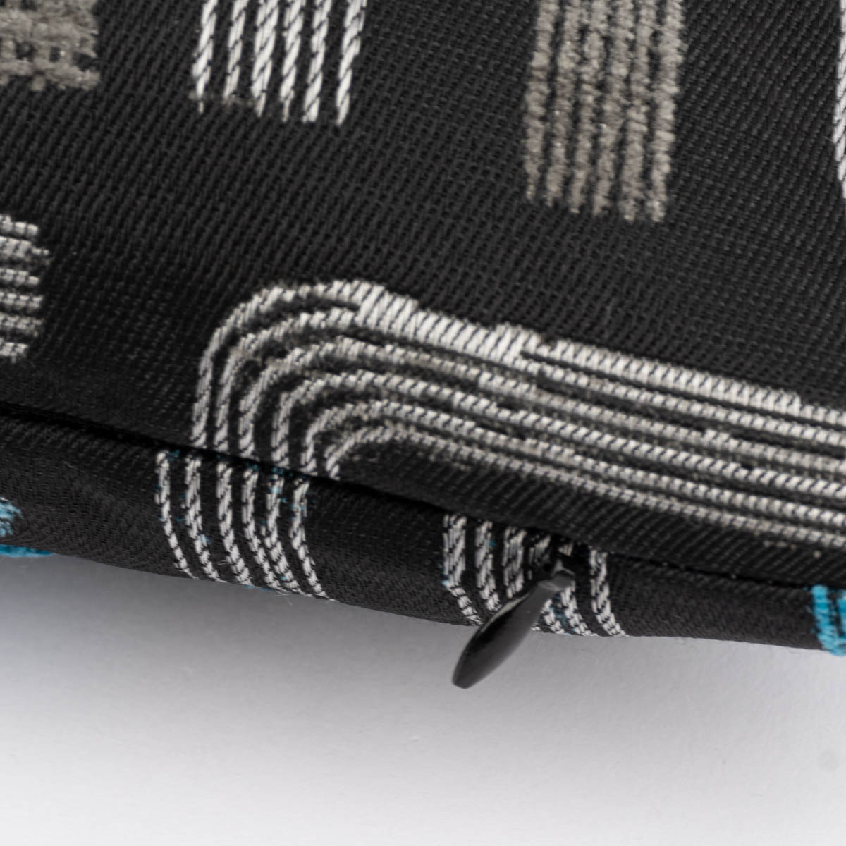 Jacquard bedeutet, dass das Muster eingewebt und nicht nur aufgedruckt ist. Hier ein Muster aus lauter abgerundeter Ecken in unterschiedlichen Größen, angeordnet zu Vierecken die sich teilweise überlappen. Die verschiedenen Stoffstrukturen verstärken das abstrakte Muster und machen die Kissenhülle zu einer ganz besonderen. Besonders auffällig sind die Bereiche aus Chenillegarn.