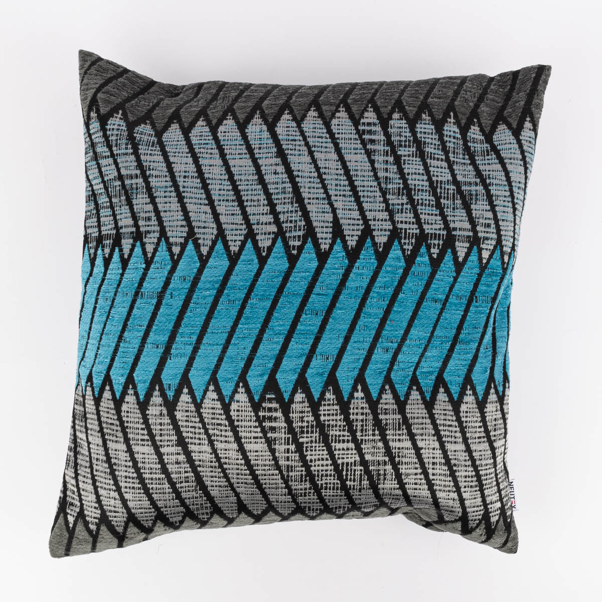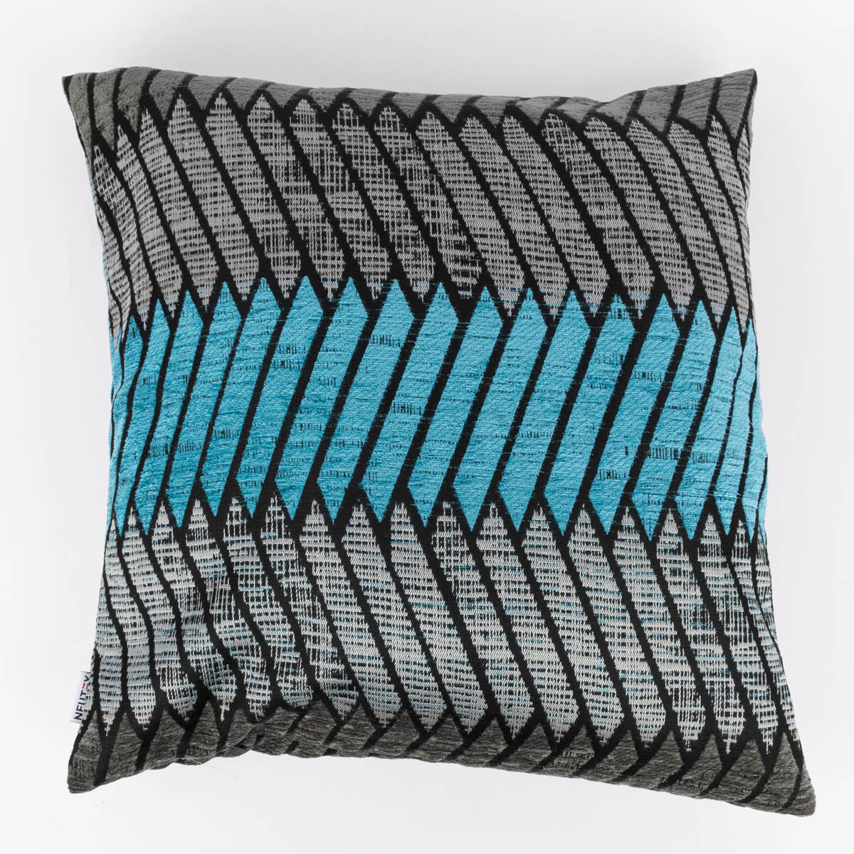Die Kissenhülle begeistert durch ihr raffiniertes Design aus verschiedenen Stoffstrukturen und das modische Muster. Die Hülle besteht aus einem Jacquard-Gewebe. Das heißt, das Muster ist eingewebt und zeugt von einer hochwertigen Qualität. Verschiedene Stoffstrukturen wechseln sich in einer Art Rautenmuster ab. Das eine ist ein etwas glatteres Gewebe mit dunklen Fadenwebungen, das andere ist ein Chenillegewebe.