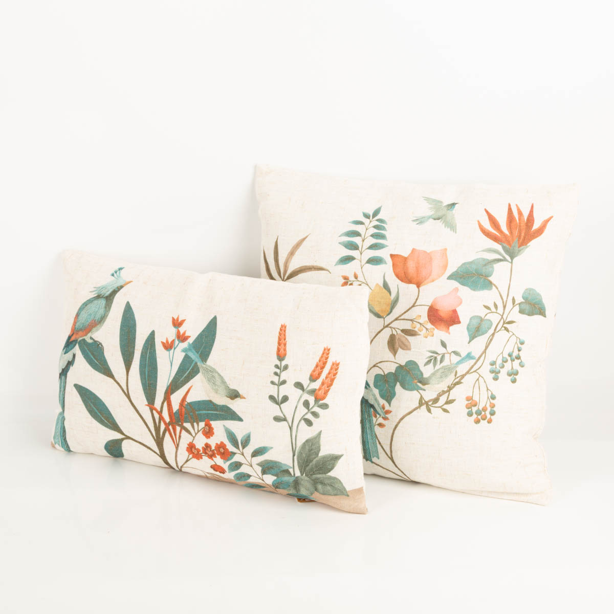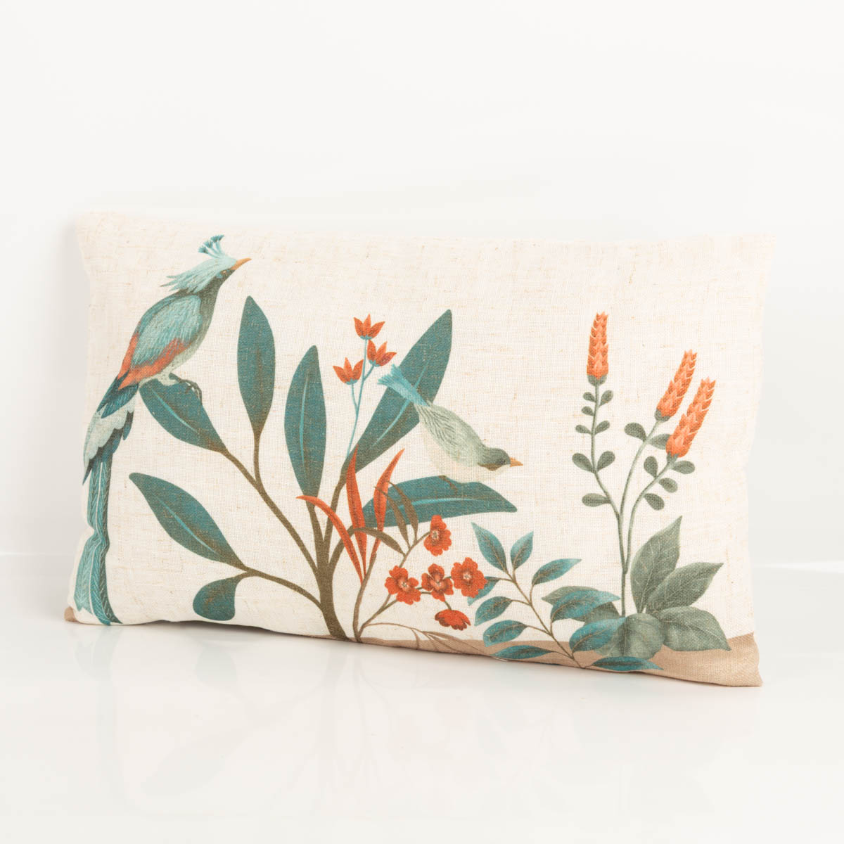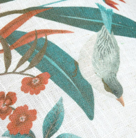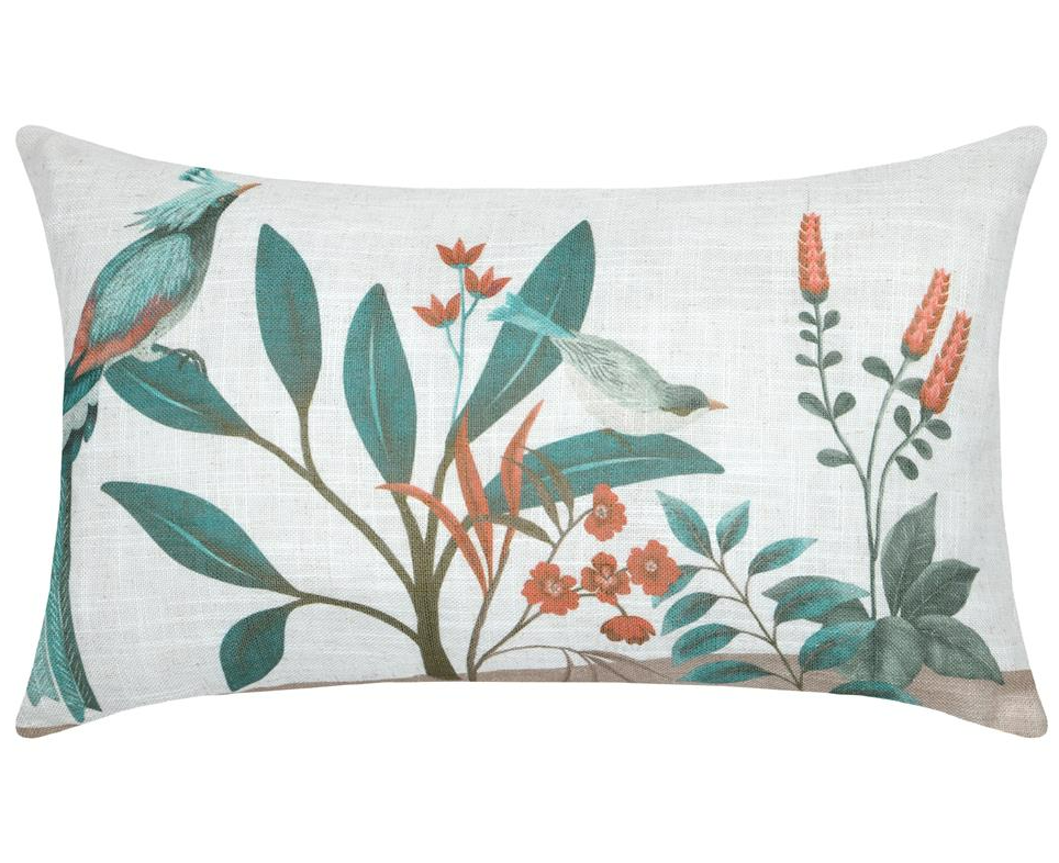 Dekokissen mit extravagantem Dessin aus Vögeln, Blumen und Blättern