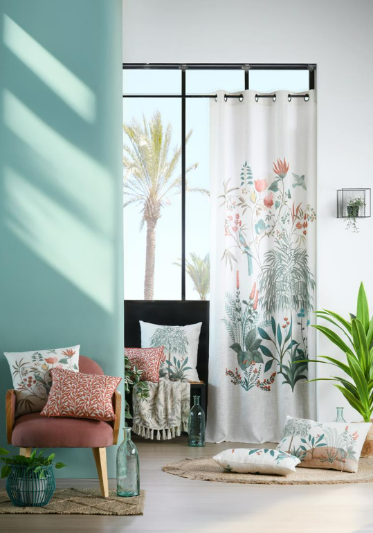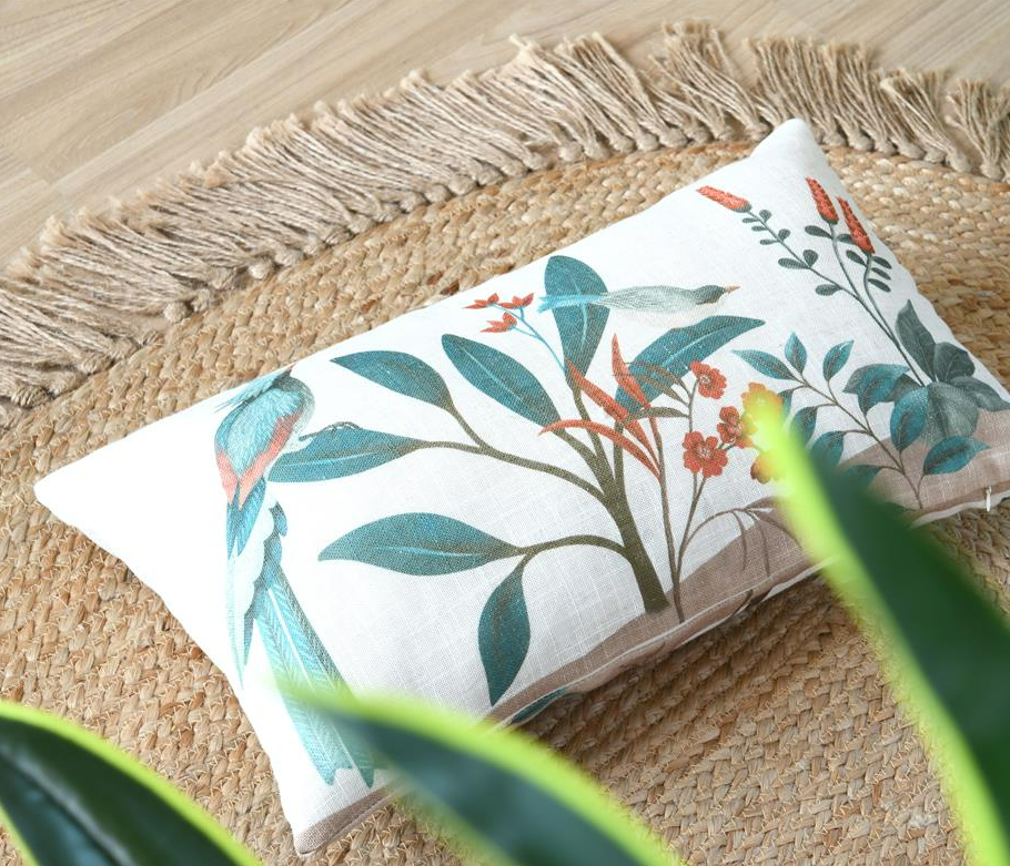 Dieses Dekokissen mit ausdrucksstarkem Vogel- und Blütendessin bringt natürliche Eleganz und besondere Akzente in dein Zuhause. Das exklusive Dessin aus Frankreich zeigt fein illustrierte Vögel, Blätter und Blumen in harmonischen Naturtönen, ergänzt durch marsala und grün. Das längliche Format macht das Kissen ideal für Sofa, Bank oder Bett.