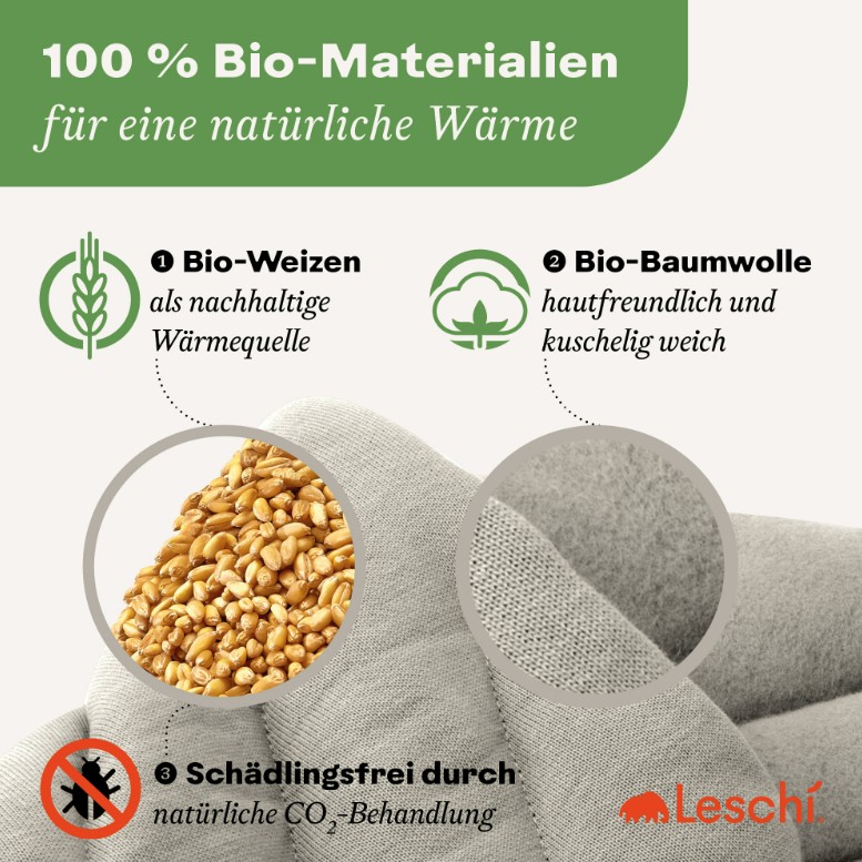 Natürliche Bio-Materialien: Füllung aus 100 % Bio-Weizen, Bezug aus 100 % Bio-Baumwolle – nachhaltig & hautfreundlich.