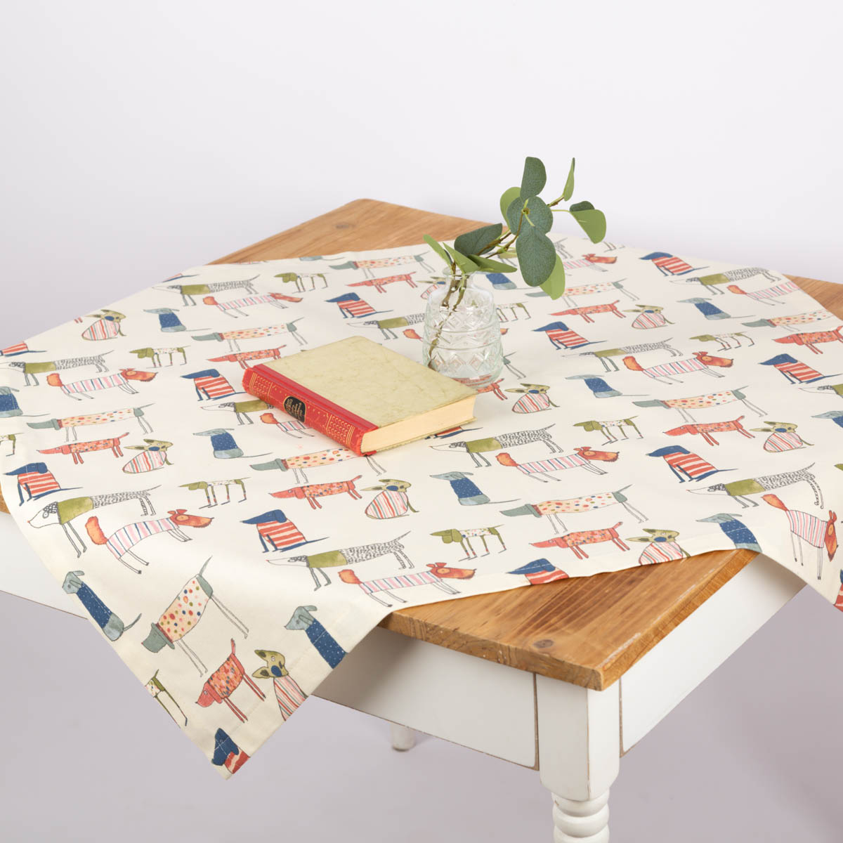 Dazu passt die Mitteldecke Tischdecke mit bunten Hunden