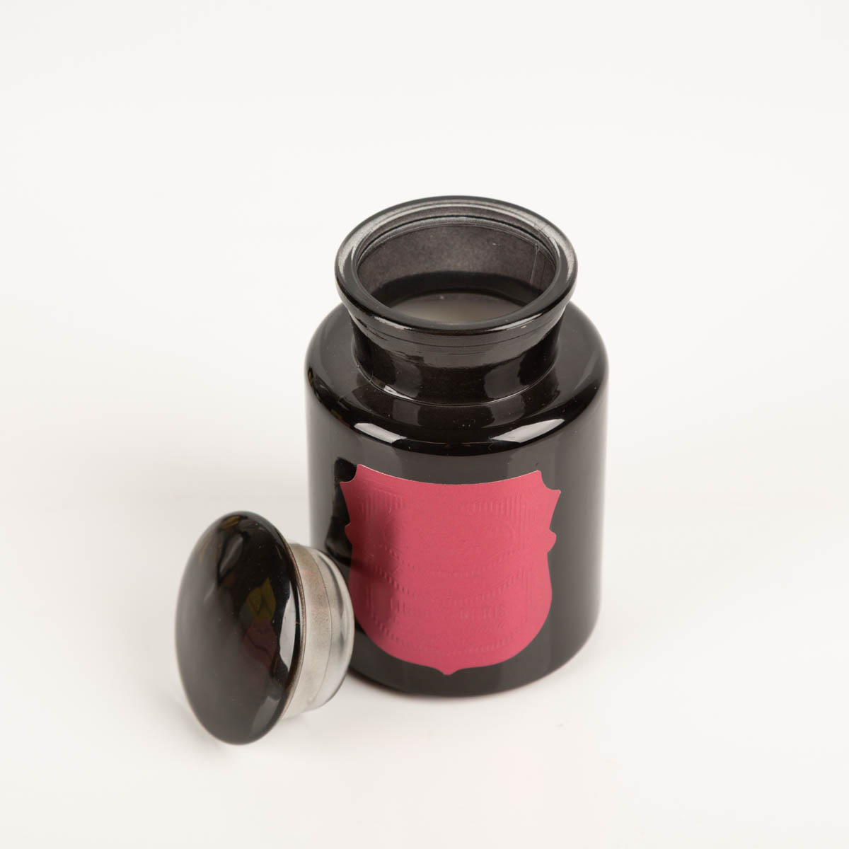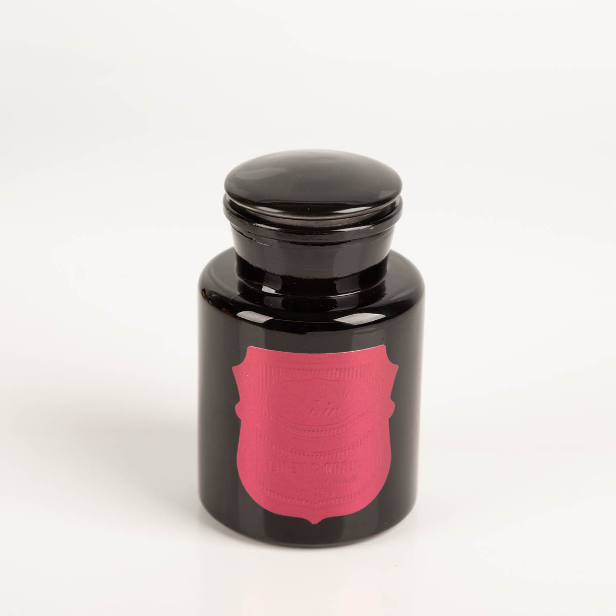Schwarzes Glas im klassischen Apothekerstil mit geprägtem Metallic-Etikett