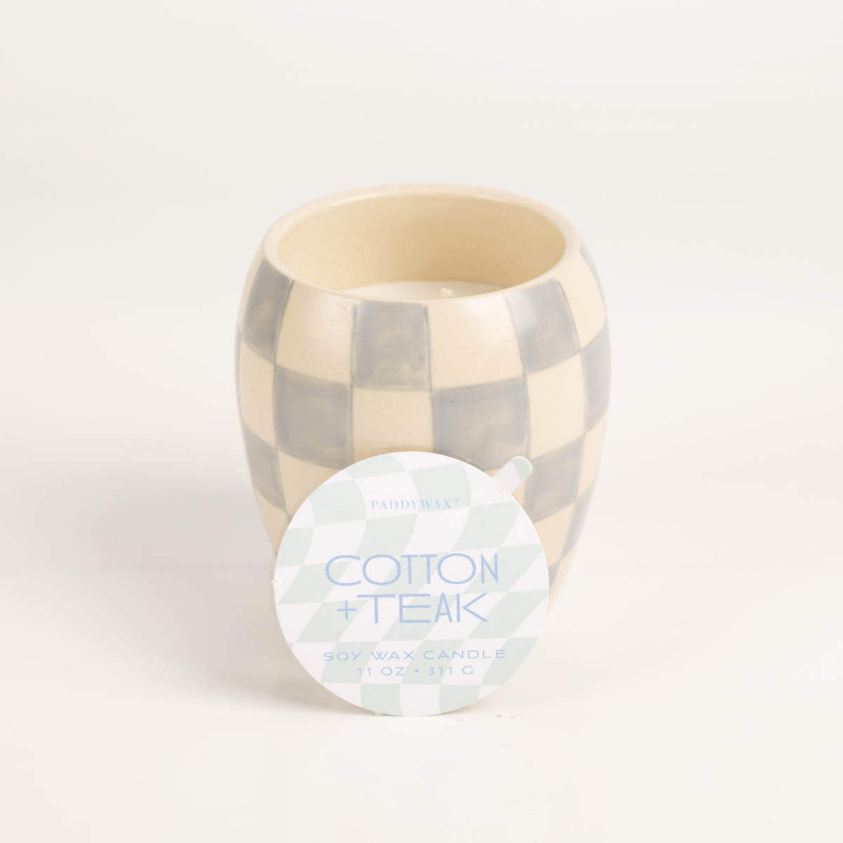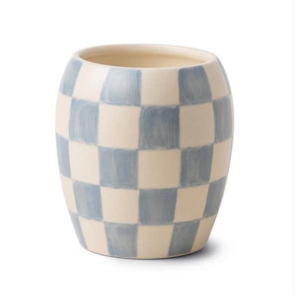 Paddywax Checkmate Duftkerze light blue – frische Würze trifft grafisches Design