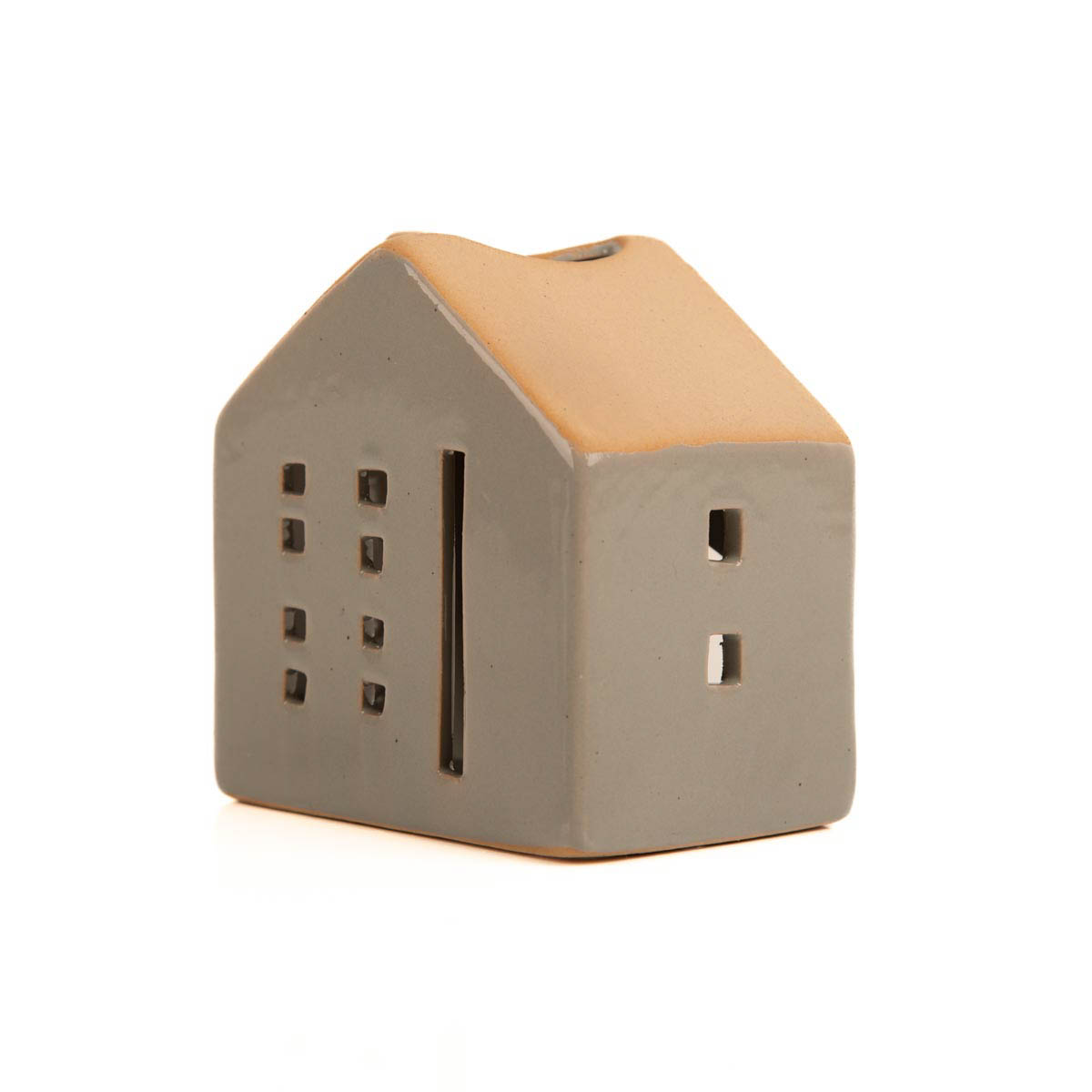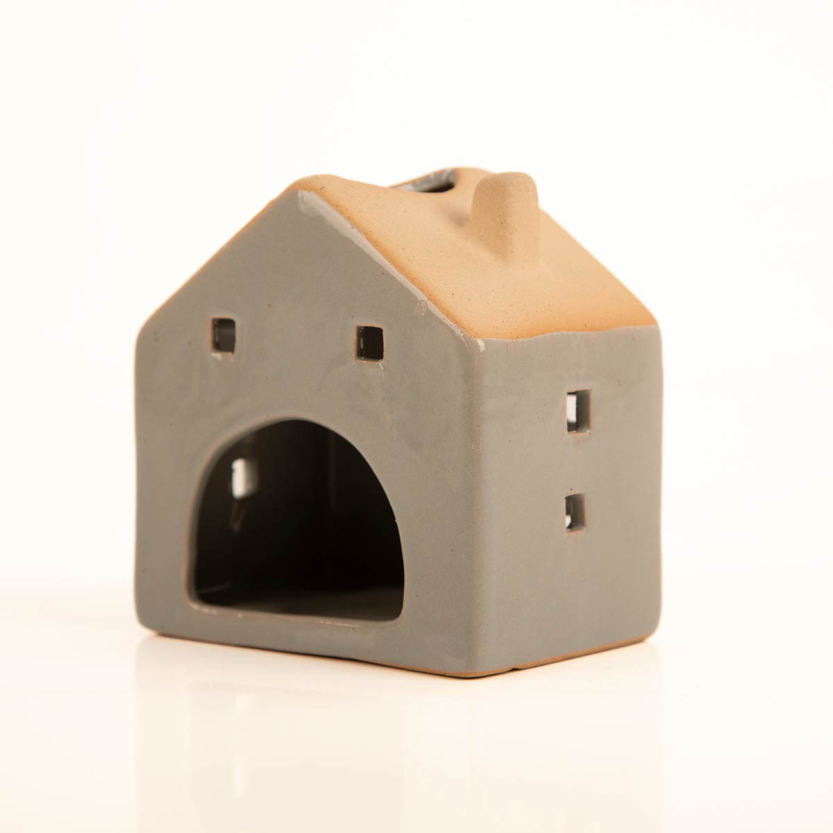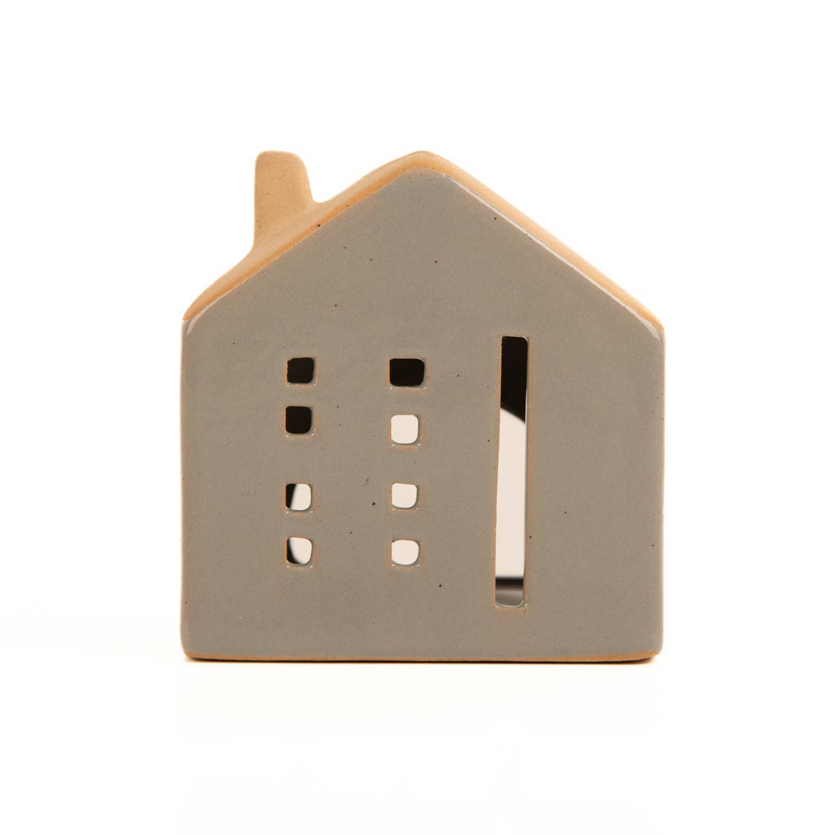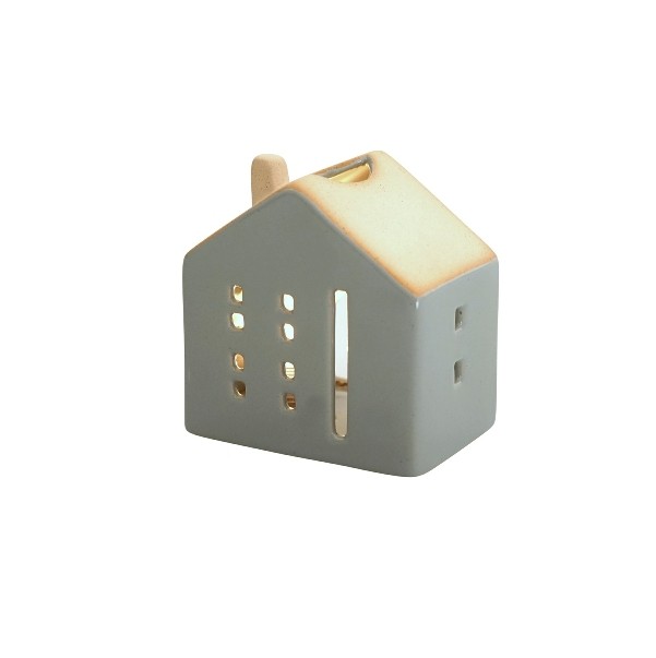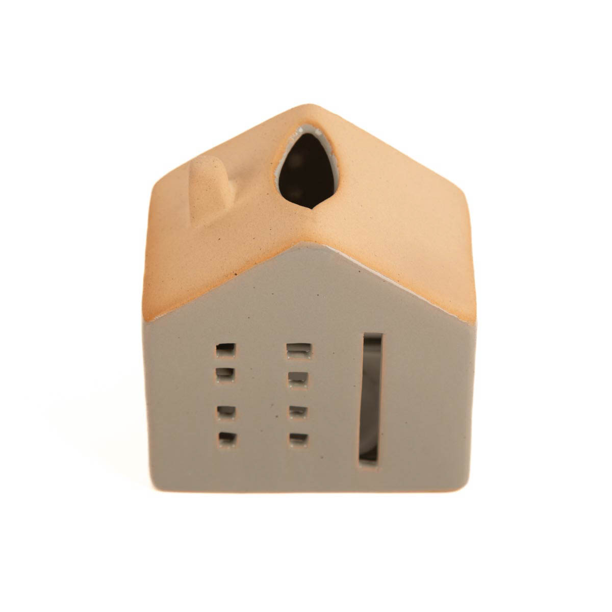 • Keramikhaus-Windlicht in Hellgrau mit naturfarbenem Dach