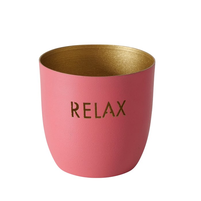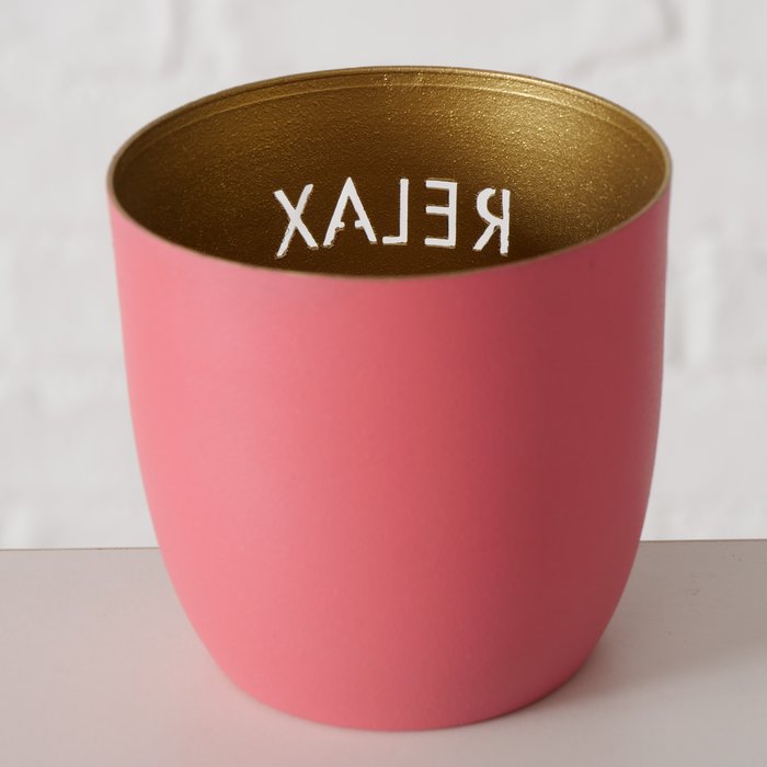 Hübsches Windlicht in Pink-Gold mit Cutout Relax, Smile oder Enjoy – hier kannst du entscheiden.